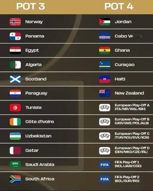 世界盃抽籤今晚深夜舉行,由32隊改制加到48隊之後,出現死亡之組嘅機會細咗。不過都唔係冇可能,喺Pot3嘅挪威係人都怕咗佢,而意大利贏到附加賽嘅話就會喺Pot4,加埋Pot1阿根廷 & Pot2嘅摩洛哥都幾得人驚(分組賽同洲只會有一隊/歐洲就最多兩隊)…史上經典死亡之組唔少,但02年嗰屆瑞、英、阿、尼原來只係排第5… (客觀定義嘅死亡之組係計四隊嘅世界排名)一齊嚟睇下排名前五嘅世界盃死亡分組係邊幾個?! 🇺🇸🇨🇦🇲🇽