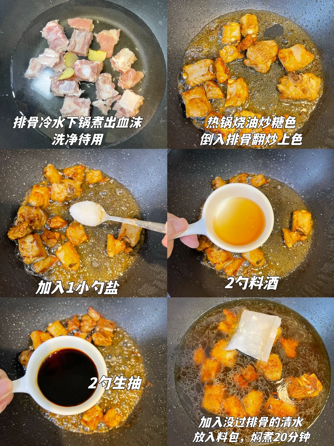 2,热锅炒糖色,倒入排骨翻炒上色,加1勺盐+2勺料酒+2勺生抽+适量清水,再放入香料包,焖煮20分钟