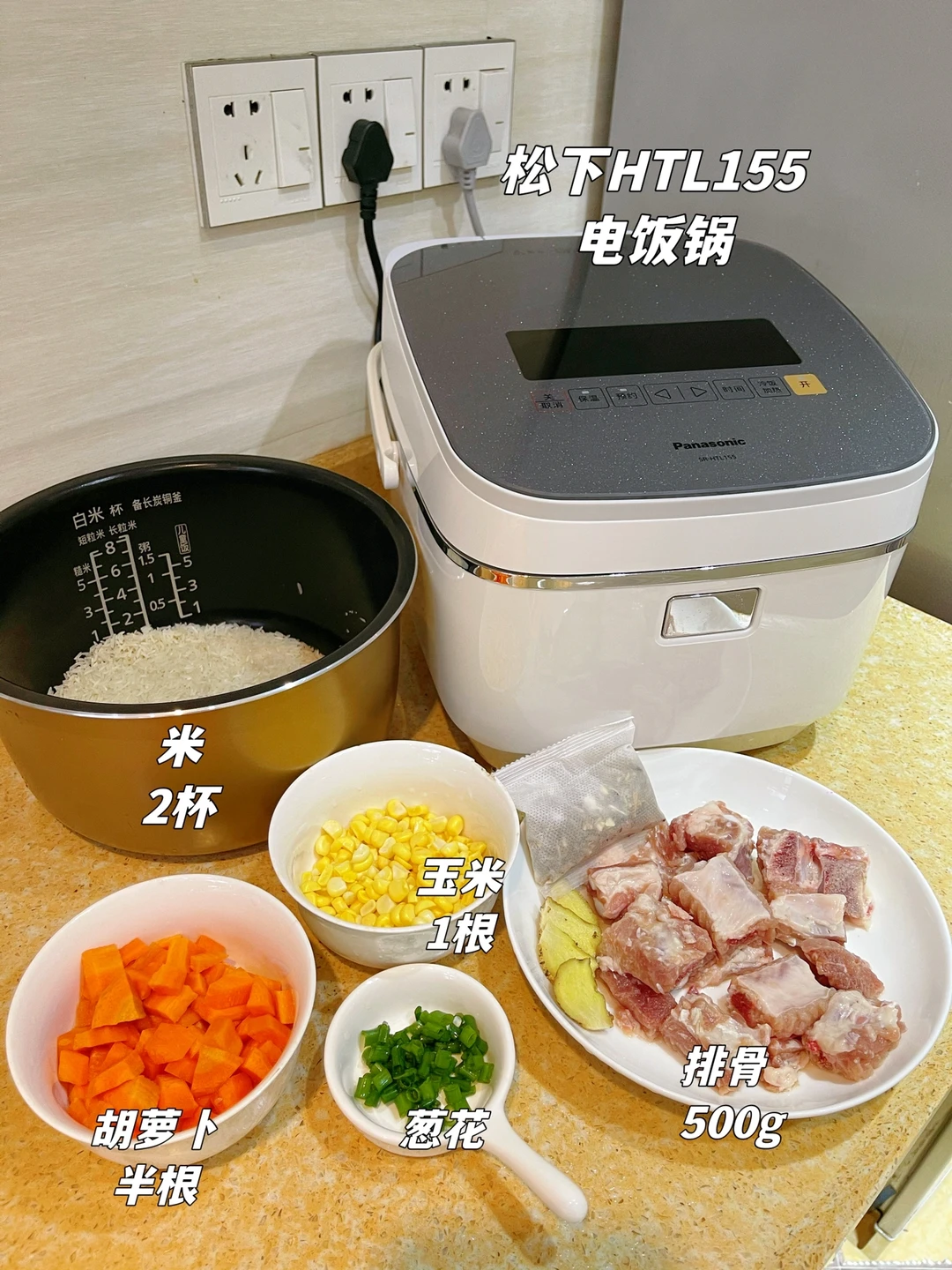 【食材】:排骨500g,大米2杯,玉米1根,胡萝卜半根,香料包(香叶、桂皮、八角),姜片