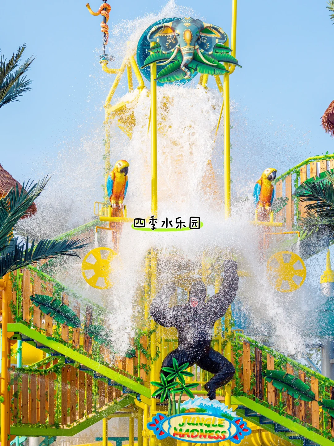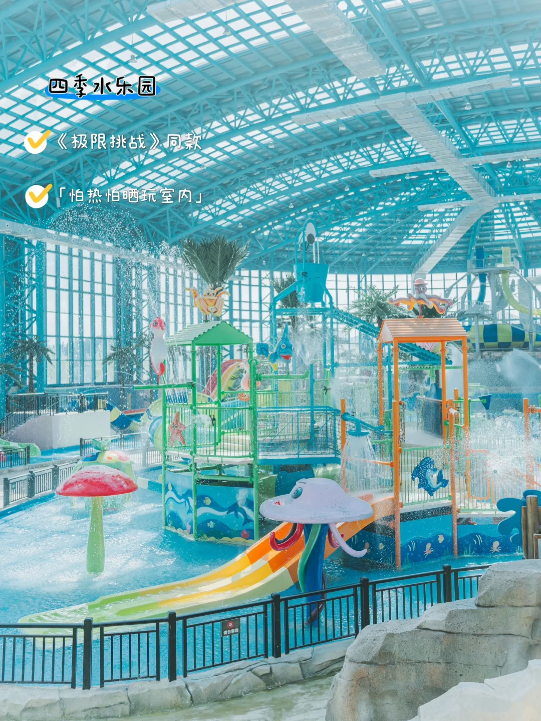 可以约上小伙伴打卡《极限挑战》同款四季水上乐园。室内外一体水乐园,qiao多游乐🎡设施,通通玩个遍~衣服👔湿了可以换,鞋子👟湿了可以晒,没带泳衣🩱也不用担心!这里的多巴胺色系海洋🐙动物雕塑,原相机色彩,怎么拍都好看📷!