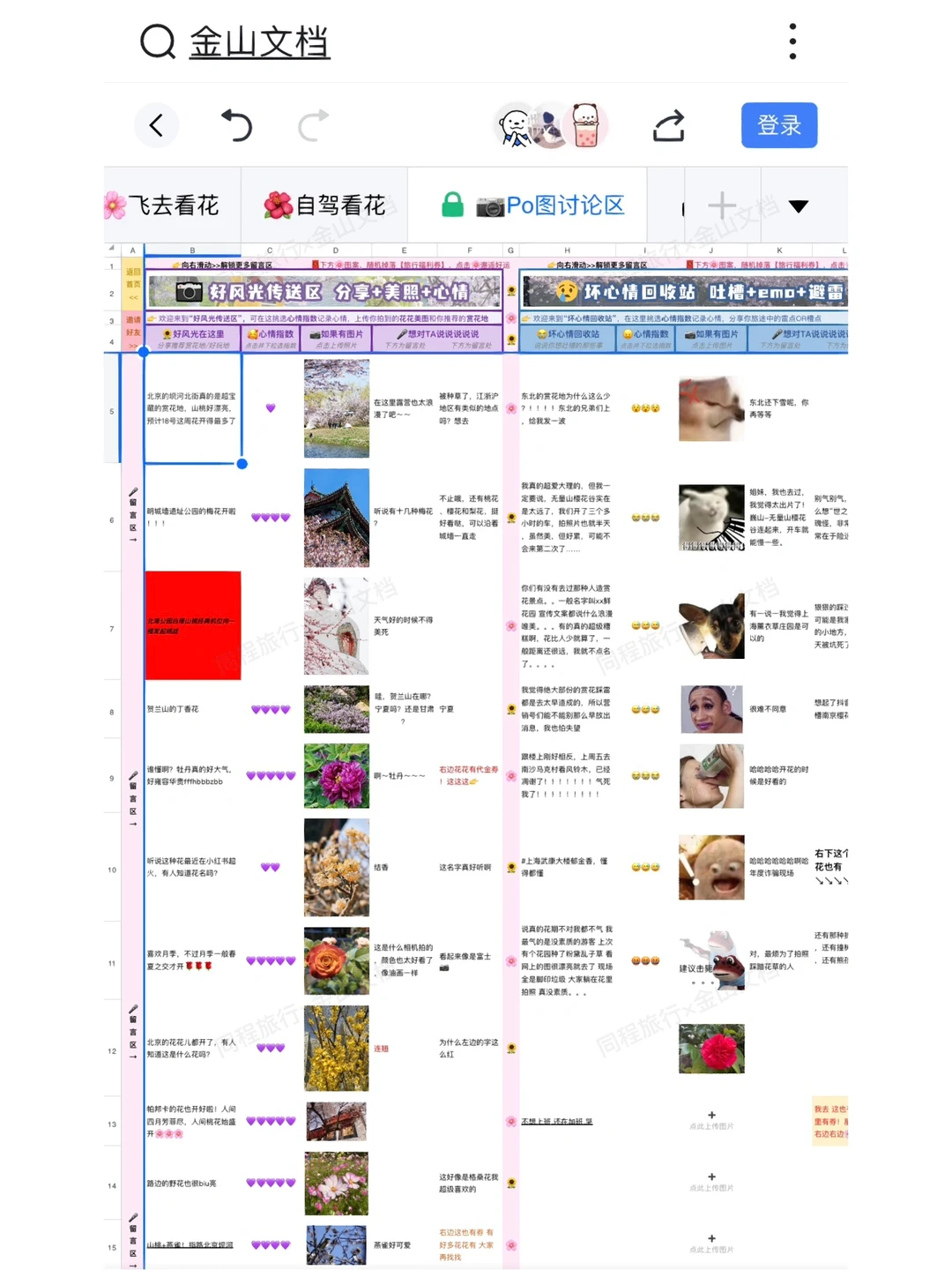 文档内甚至还 有讨论区,即时信息互通有无,还能po图📷,大家一起评论聊天。说不定还能来个花海偶遇,想想就很浪漫呀❗️另外还有DIY涂鸦区,可爱的花花等你解锁🔓。