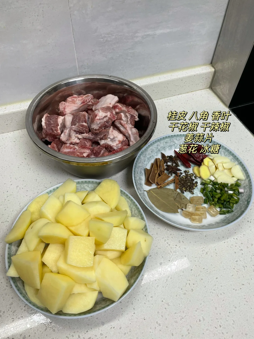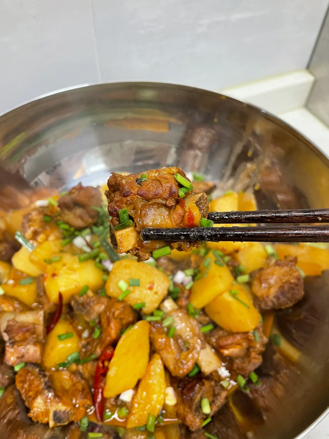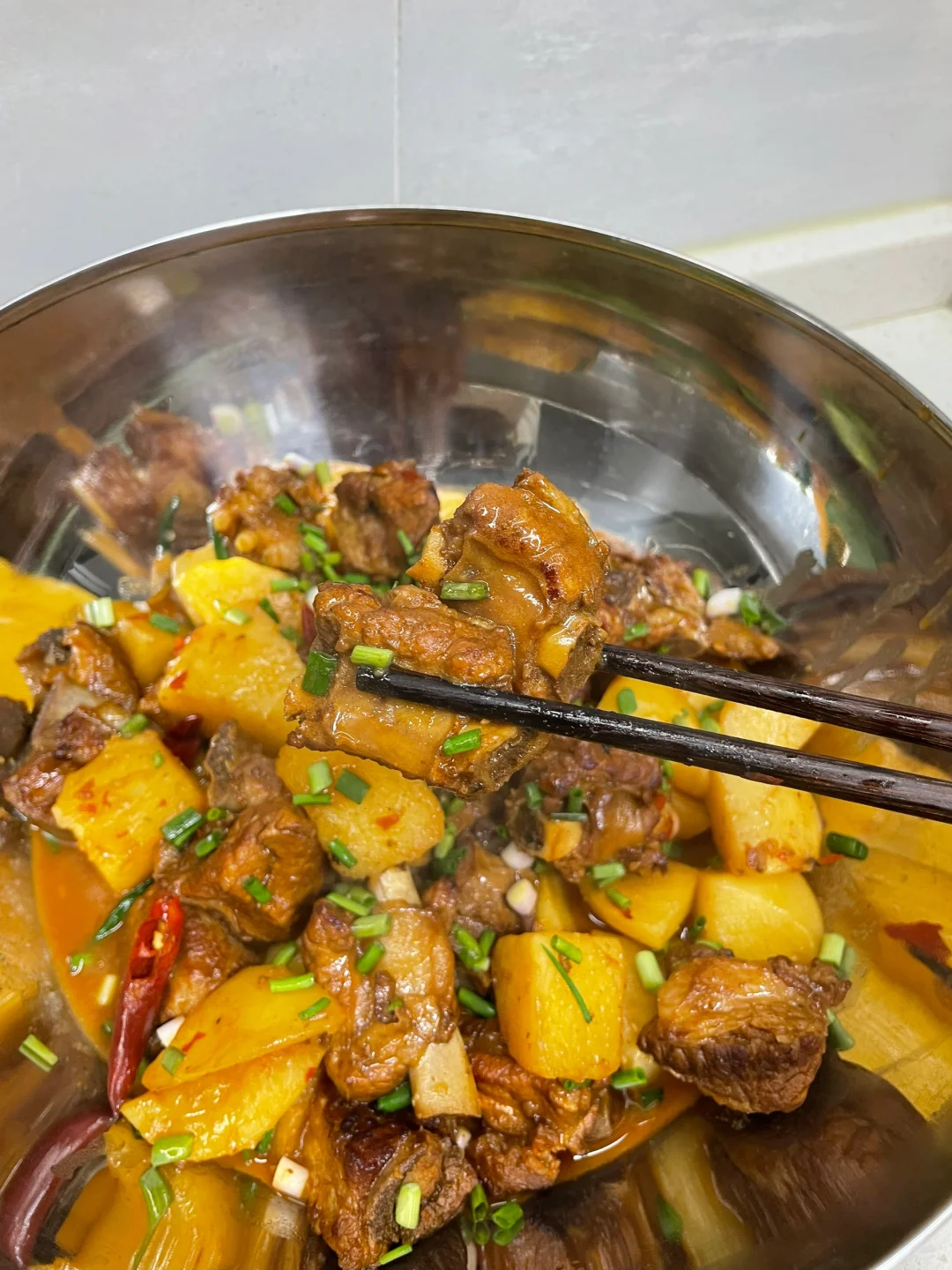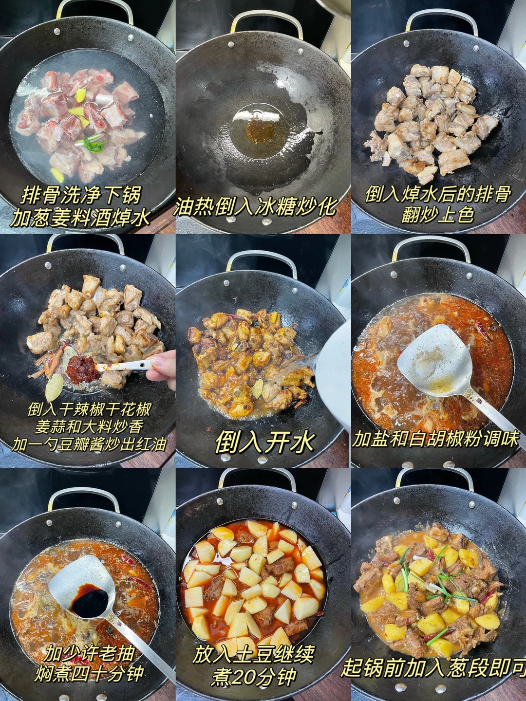 红烧排骨也太香了,排骨和土豆都炖烂了,超级入味,汤汁泡饭绝绝子 1⃣️:土豆滚刀切块,排骨洗净下锅加葱姜料酒焯水去腥后捞出控干水分 2⃣️:油热放入冰糖炒化,放入排骨翻炒上色,再放入干花椒干辣椒 姜蒜片和大料炒香,加一勺豆瓣酱炒出红油 3⃣️:锅中倒入适量开水没过食材,加盐 胡椒粉和老抽调味,转中小火盖盖焖煮四十分钟左右,再倒入排骨焖煮二十分钟,起锅前根据自己口味加入鸡精和葱段即可
