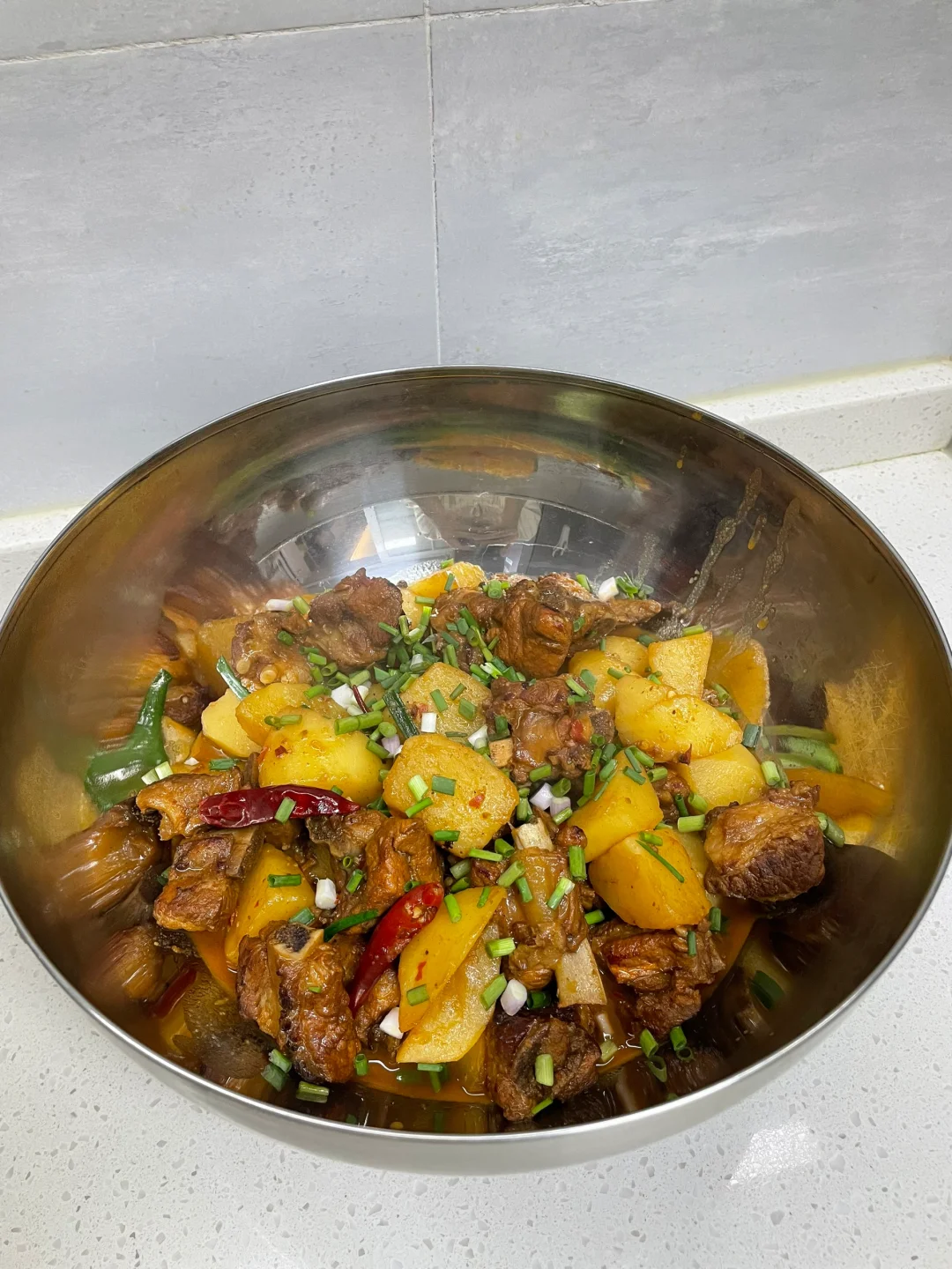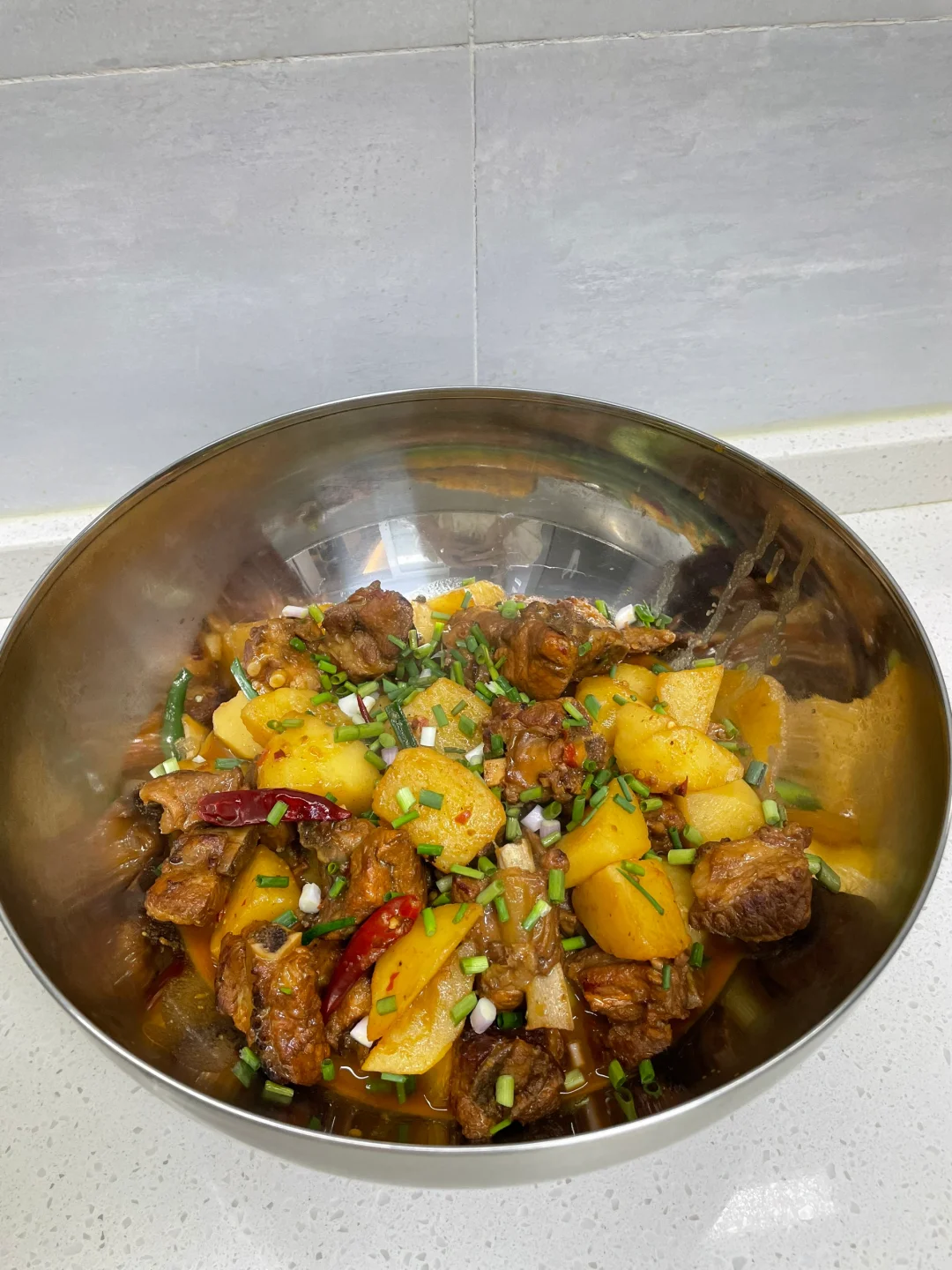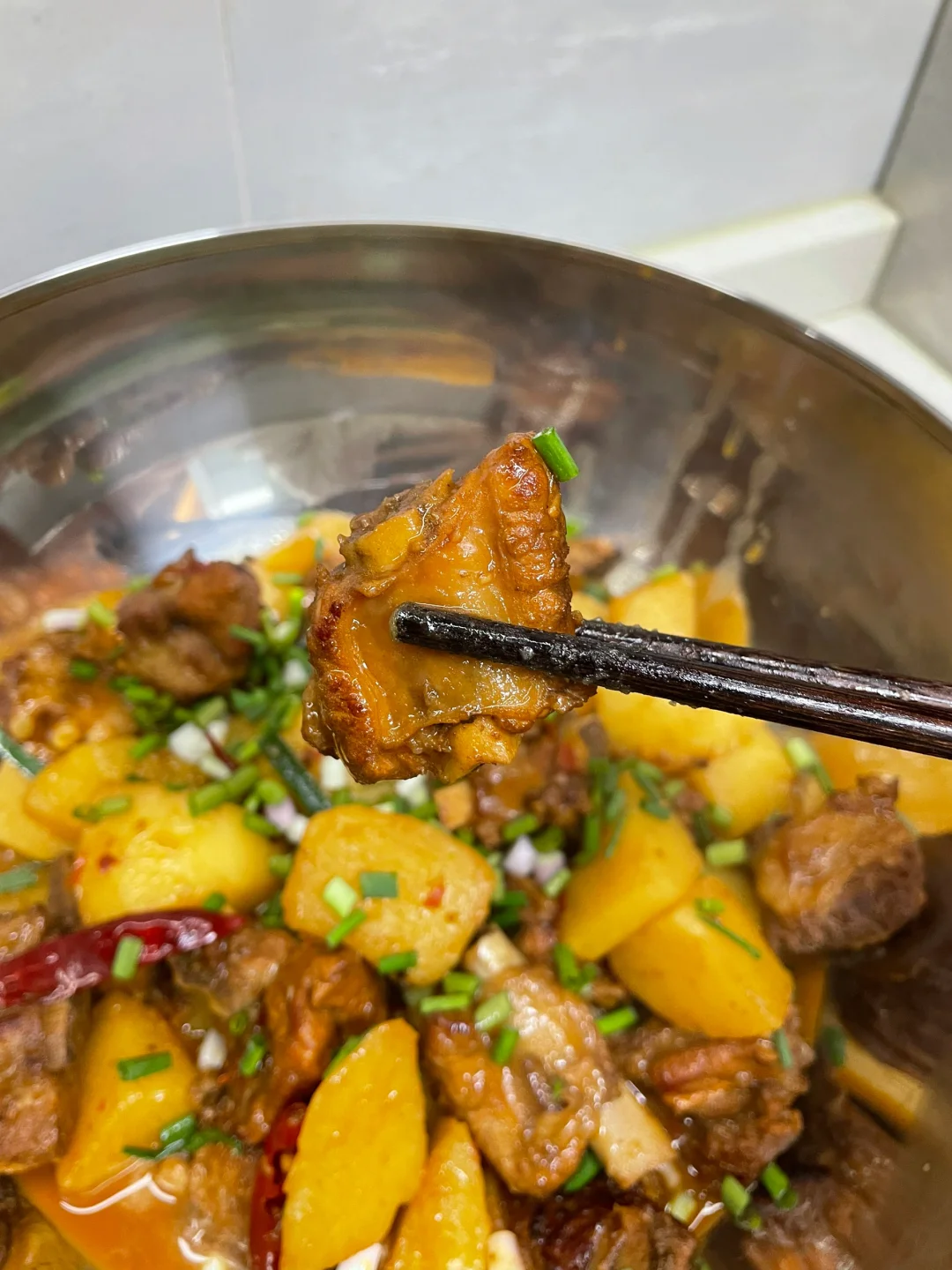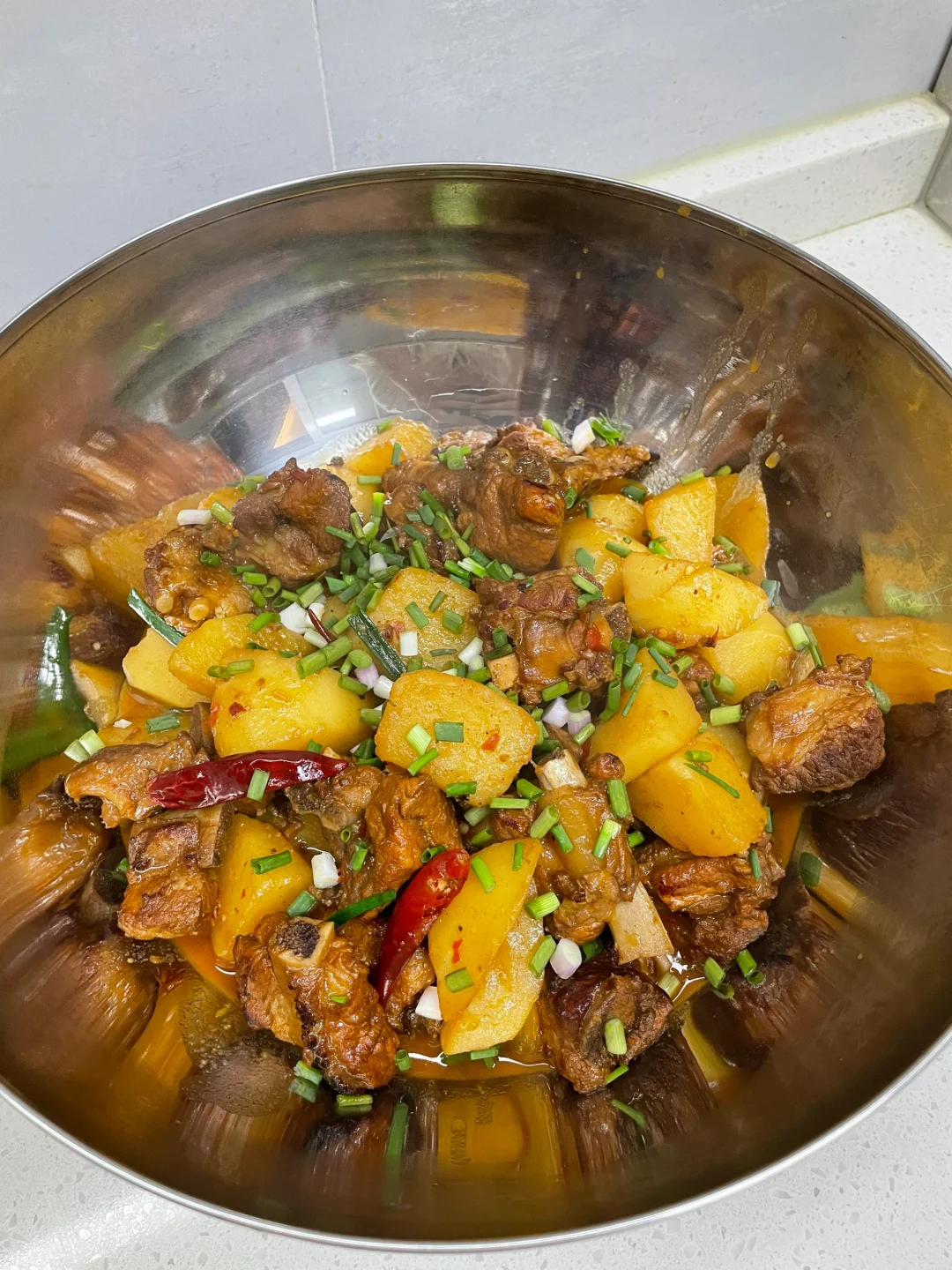 红烧排骨也太香了,排骨和土豆都炖烂了,超级入味,汤汁泡饭绝绝子 1⃣️:土豆滚刀切块,排骨洗净下锅加葱姜料酒焯水去腥后捞出控干水分 2⃣️:油热放入冰糖炒化,放入排骨翻炒上色,再放入干花椒干辣椒 姜蒜片和大料炒香,加一勺豆瓣酱炒出红油 3⃣️:锅中倒入适量开水没过食材,加盐 胡椒粉和老抽调味,转中小火盖盖焖煮四十分钟左右,再倒入排骨焖煮二十分钟,起锅前根据自己口味加入鸡精和葱段即可
