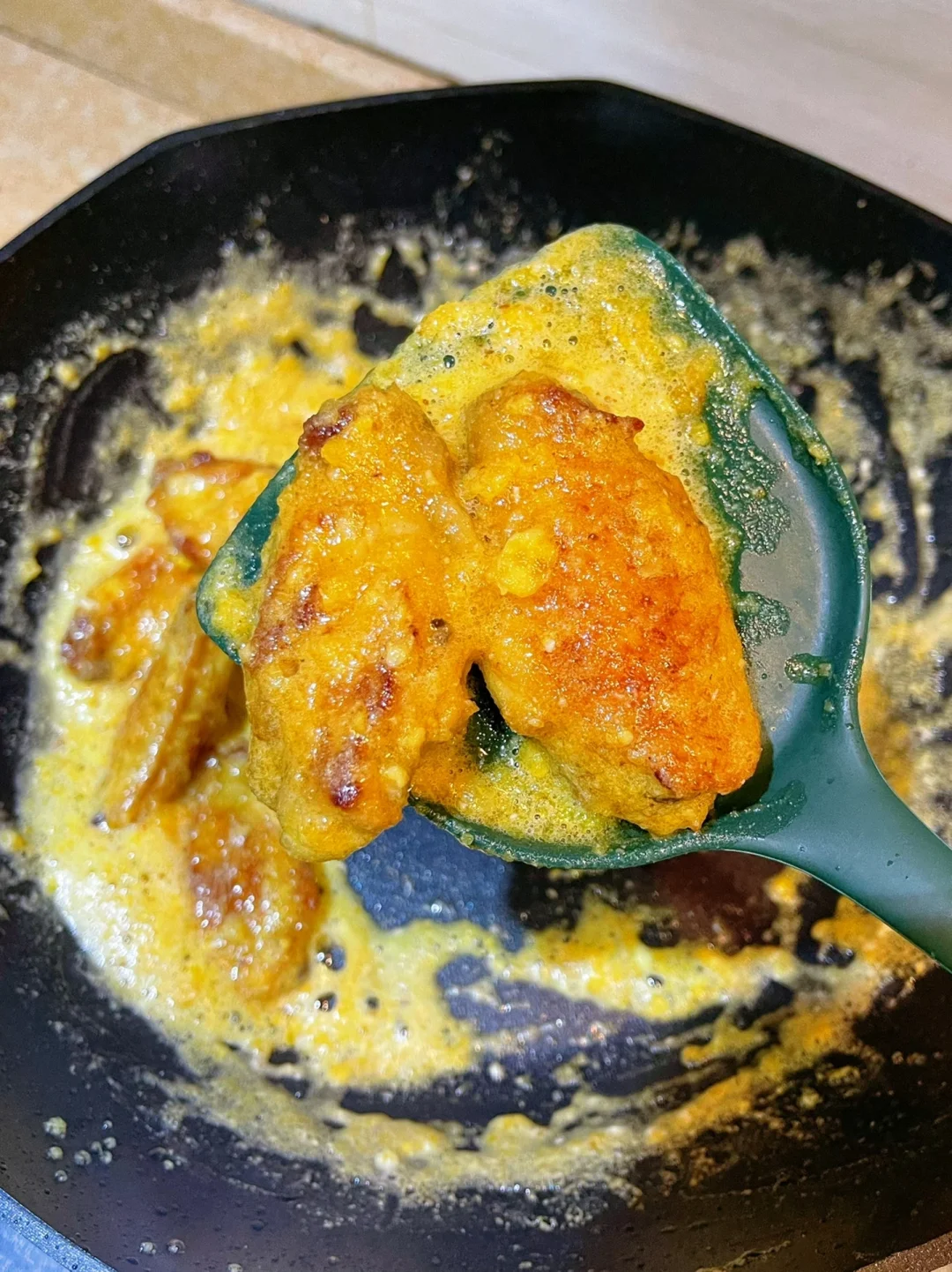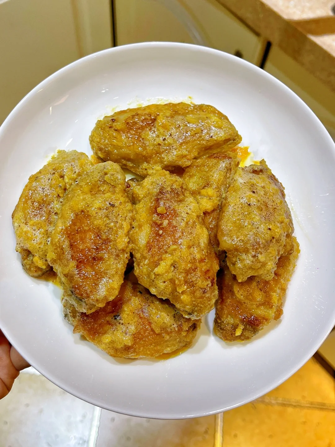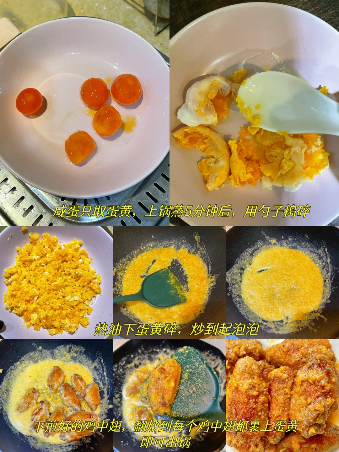 5⃣️起锅烧油,把蛋黄碎倒入,炒至起泡,倒入鸡中翅翻炒均匀,让每个鸡翅都裹上蛋黄沫,即可出锅✅