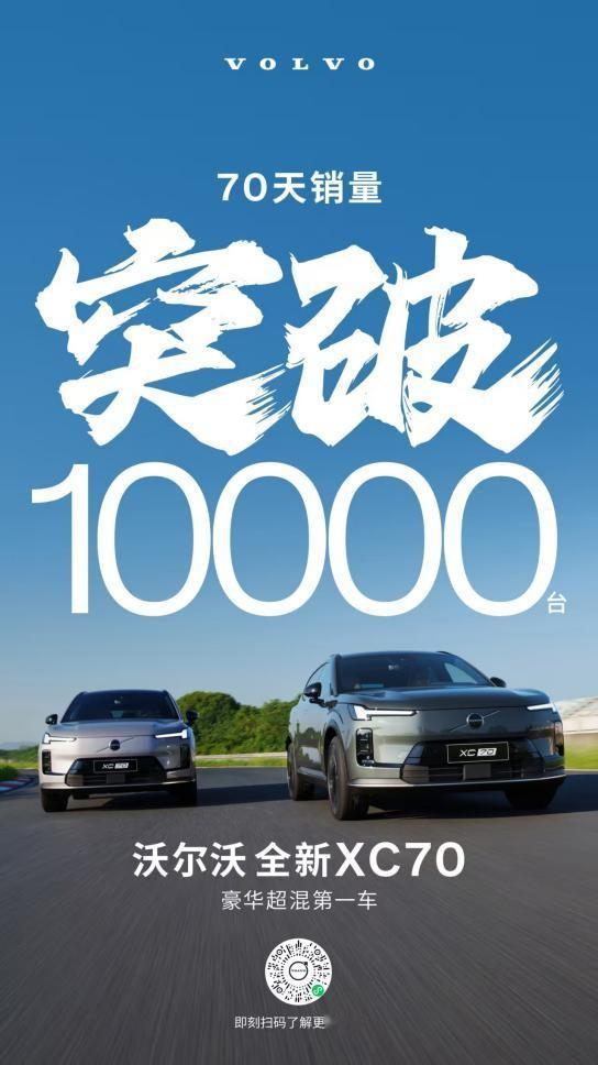 12月5日,沃尔沃全新XC70累计销量正式突破10,000辆!自9月26日上市以来,仅用70天即达成这一里程碑,迎来市场“开门红”,不仅印证了消费者对这款“全能型”豪华混动车型的青睐,更充分彰显其“豪华超混第一车”的产品实力。 全新XC70与XC60共同形成沃尔沃品牌豪华中型-中大型SUV双车战略布局,精准覆盖不同用户对能源形式、空间、场景的需求;另一方面,在全新XC70的助力下,沃尔沃品牌中国大陆市场11月份新能源车型占比43%,开启电气化转型新篇章。 全新XC70集深厚的品牌积淀、前瞻的混动技术与领先的智能体验于一身,为用户提供了一个无需妥协的豪华出行新选择。安全方面,全新XC70传承沃尔沃品牌安全基因,不仅拥有犹如“安全堡垒”一般的坚固车身,遍布全车的24个智能感知硬件与全系标配的21项智能安全辅助功能更带来了全方位的智能防护,将每一次出行化为安心守护。除了安全,强大的“四擎四驱”系统能够在7种混动模式间智能无感切换,最快实现5.28秒的百公里加速,综合续航里程更可超1200km*(1)。无论是城市通勤还是长途旅行,每一程,让用户安心启程。同时全新XC70坚持“以人为本”,融合卓越的智能科技,如场景助手功能支持用户定制不同命令,帮助用户随心创造个性化的愉悦旅程。车机所搭载的AI大模型*(2),支持多轮专业知识解答,并通过AI大模型联网搜索,还支持口语化的热点搜索与新闻播报;提供车辆操作指南、功能查询、故障诊断等一站式智能车书支持,覆盖用车全场景。 值此万台销售达成之际,为感谢车主的信任与支持,沃尔沃汽车特别为前10,000名XC70车主准备了一款精心打造的北欧休闲旅行包,以此回馈这份珍贵的信赖。未来,沃尔沃汽车将继续秉持"以人为本"的理念,为用户带来更多超越期待的出行体验。 *(1 )以上数据来源于特定测试工况和实验环境,实际数据受驾驶习惯和环境因素等影响会产生偏差。 *(2)AI大模型功能受限于审批登记,以实际提供为准。