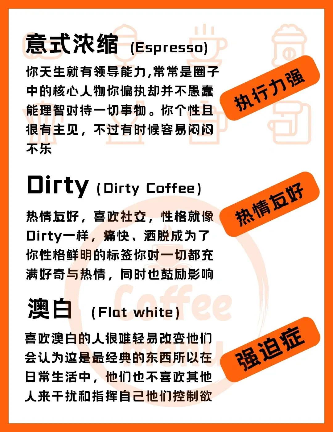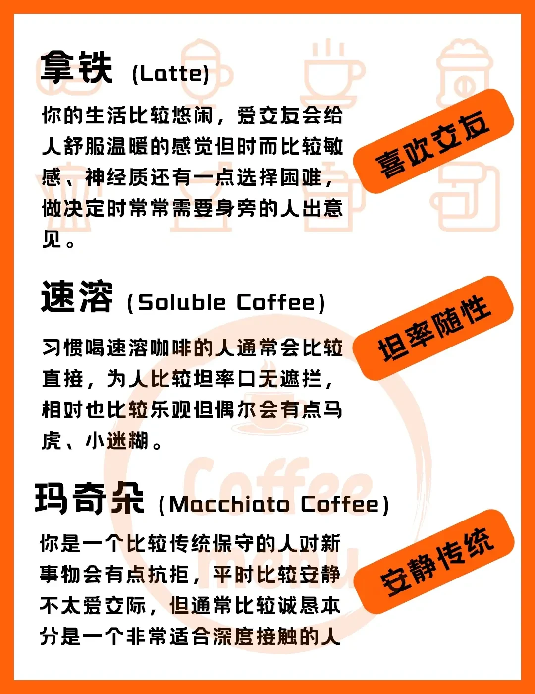 摩卡——爱玩爱自由 冰美式——极简主义者 意式浓缩——执行力强 Dirty——热情友好 澳白——强迫症 拿铁——喜欢交友 速溶——坦率随性 玛奇朵——安静传统 热美式——中医药状元 -