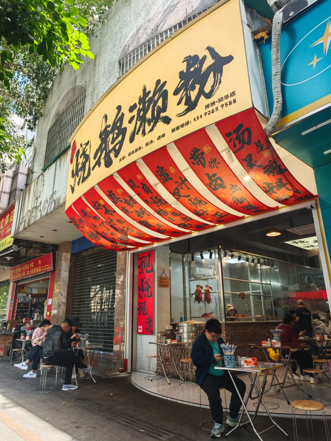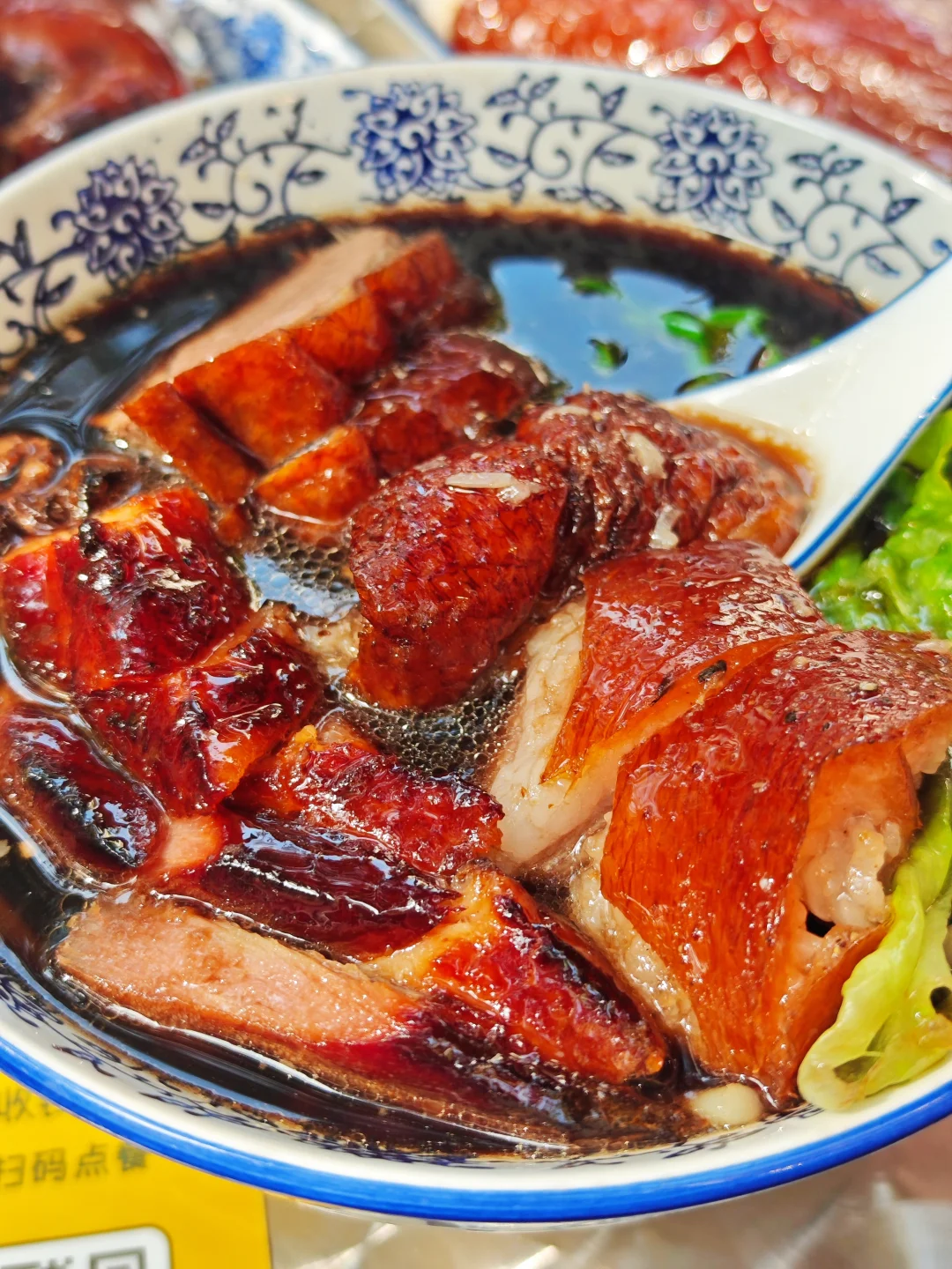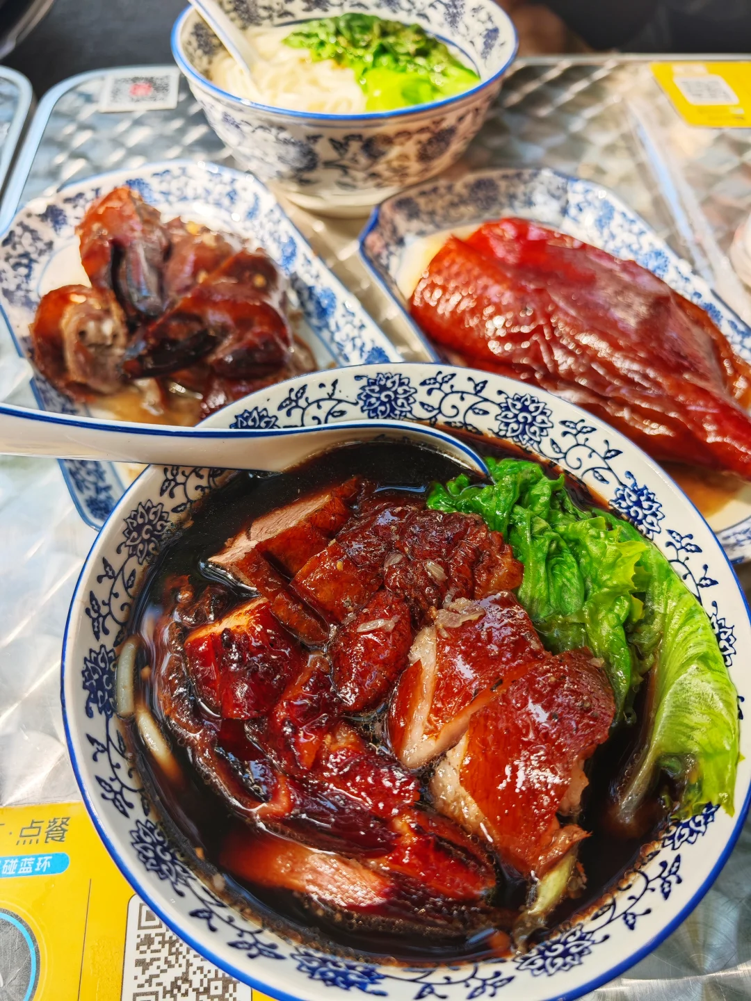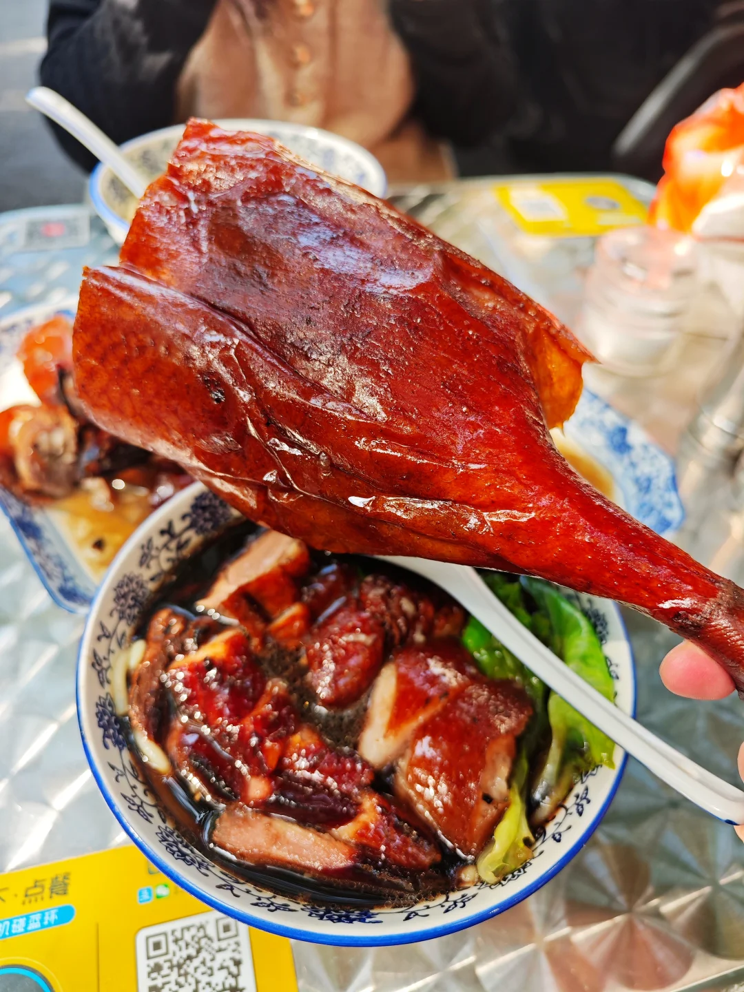 现点现砍的烧鹅濑粉真香! 鹅腿比手掌还大🍗 皮脆得咔嚓咔嚓~ 肉汁多到顺着手指流!!! 汤底,生熟地跟莞式差不多 鸡汤汤底更滋补好吃 濑粉滑溜溜的,是我的菜 偷偷说: 这间店11点半第一炉出炉🔥 那个皮脆到发光!!! 记得早点去蹲鹅腿~ 不然秒没🤫 烧鹅吃得多会滞 建议小胃口的点餐慎重 (省钱攻略一份烧鹅腿濑粉+一个斋汤粉)