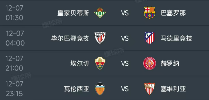 北京时间12月7日,明天的西甲联赛第15轮赛程如下: 第一场01:30,皇家贝蒂斯PK巴萨:巴萨上一场3-1逆转马竞迎来5连胜,目前领先皇马1分暂列第一,对于巴萨来说竞争冠军的对手就是皇马,他们做好自己巩固榜首。皇家贝蒂斯目前以24分暂列第5名。 第二场04:00,毕尔巴鄂竞技PK马竞:马竞上一场1-3不敌巴萨,遭遇赛季第二败,明天的客场之行立足防守,避免连败 第三场21:00,埃尔切PK赫罗纳:赫罗纳目前排在倒数第三,他们要为了保级而战 第四场23:15,瓦伦西亚PK塞维利亚:瓦伦西亚目前的积分是14分,塞维利亚以16分暂列第13名。