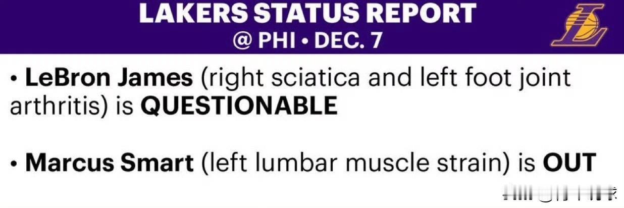 继续伤缺!湖人队又一个“文森特”? 湖人队官方公布了球队明天对阵76人队的伤病报告,东契奇不在名单中,意味着他已经与球队会合,可以出战明天的比赛;詹姆斯升级为出战成疑,需要根据赛前训练热身情况决定是否出战;斯玛特因腰部肌肉拉伤缺席比赛,这将是他连续缺席的第6场比赛。更让人担忧的是,斯玛特依旧没有具体的复出时间,无论是他本人还是教练组,都没有透露他何时能上场比赛。 健康的斯玛特确实是一个很好用的球员,这一点不可否认,但他的伤病隐患同样不容小觑,近两个赛季出勤率都不高,本赛季来到湖人队后同样如此,这已经极大的影响了雷迪克的阵容轮换,因为教练组对斯玛特寄予了厚望。如果不能上场比赛,再强大、再好的球员也只是空中楼阁。希望斯玛特不会成为前几个赛季的“纳恩”“文森特”,那真的太磨人了!