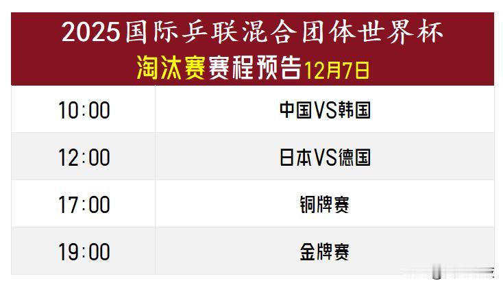 【淘汰赛赛程预告!成都国际乒联混合团体世界杯今日收官!】 淘汰赛只剩强队,中日韩加德国,不过德国避开了中国,毕竟打日本胜算要高一些! 预计,国乒夺冠,日本亚军,德国和韩国再碰面,铜牌归属悬念比较大。