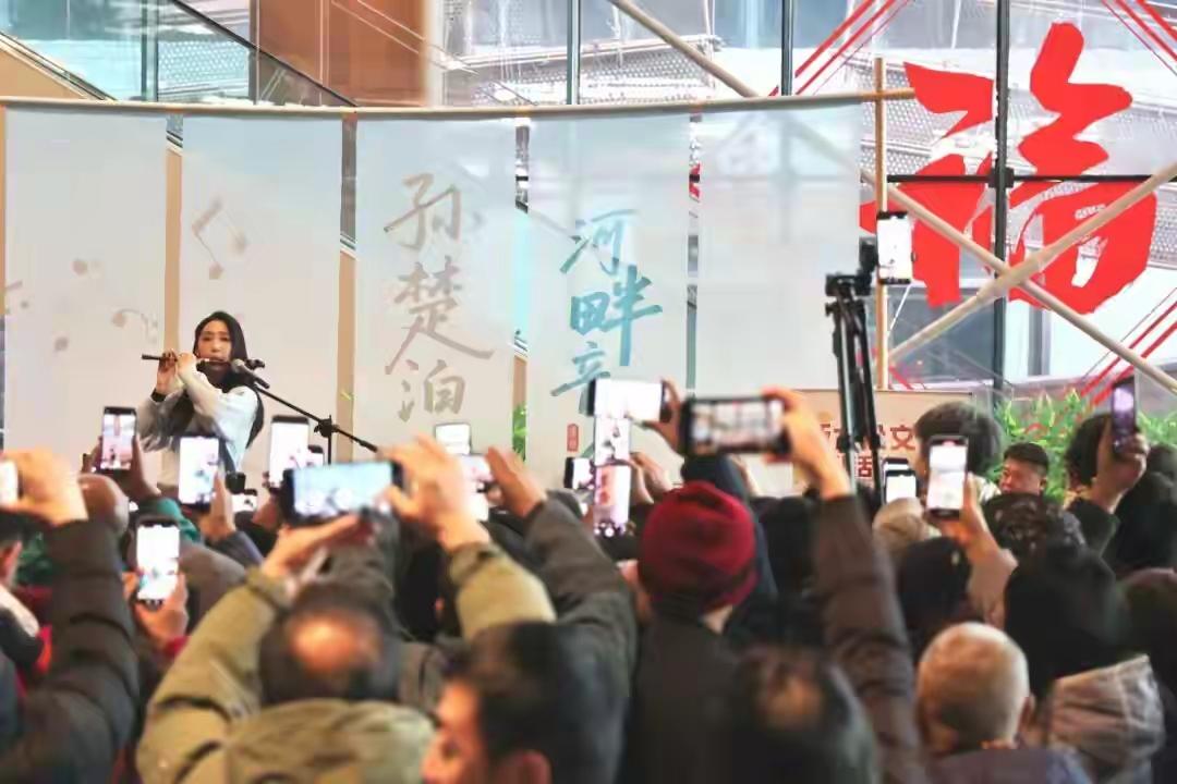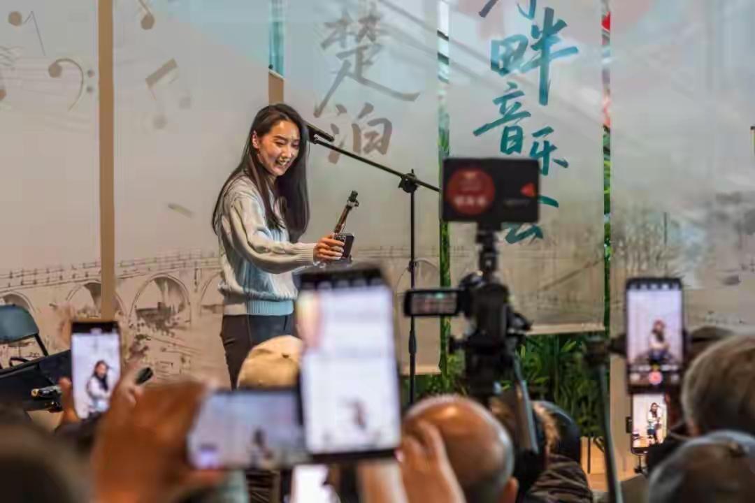 12月6日,“国民闺女”孙楚泊来通州北京大运河博物馆共享大厅演出啦!这场“河畔音乐会”是精彩的公益演出。 一个半小时里,她吹了《珊瑚颂》《步步高》等20余首曲子,乐声时而紧凑高昂、时而舒缓低鸣。当《我爱你中国》旋律响起,全场合唱,气氛超燃。77岁王师傅是她的铁杆粉丝,半年前在公园偶遇后就粉上了,还被她教过指法。从朝阳区赶来的赵大爷提前一小时到场,说听她吹笛就像听自家闺女吹。潞河中学乔云同学还和她即兴合奏《春江花月夜》。孙楚泊几度哽咽,她的“接地气”演出真的太圈粉啦! 孙楚泊笛子 孙楚泊公园
