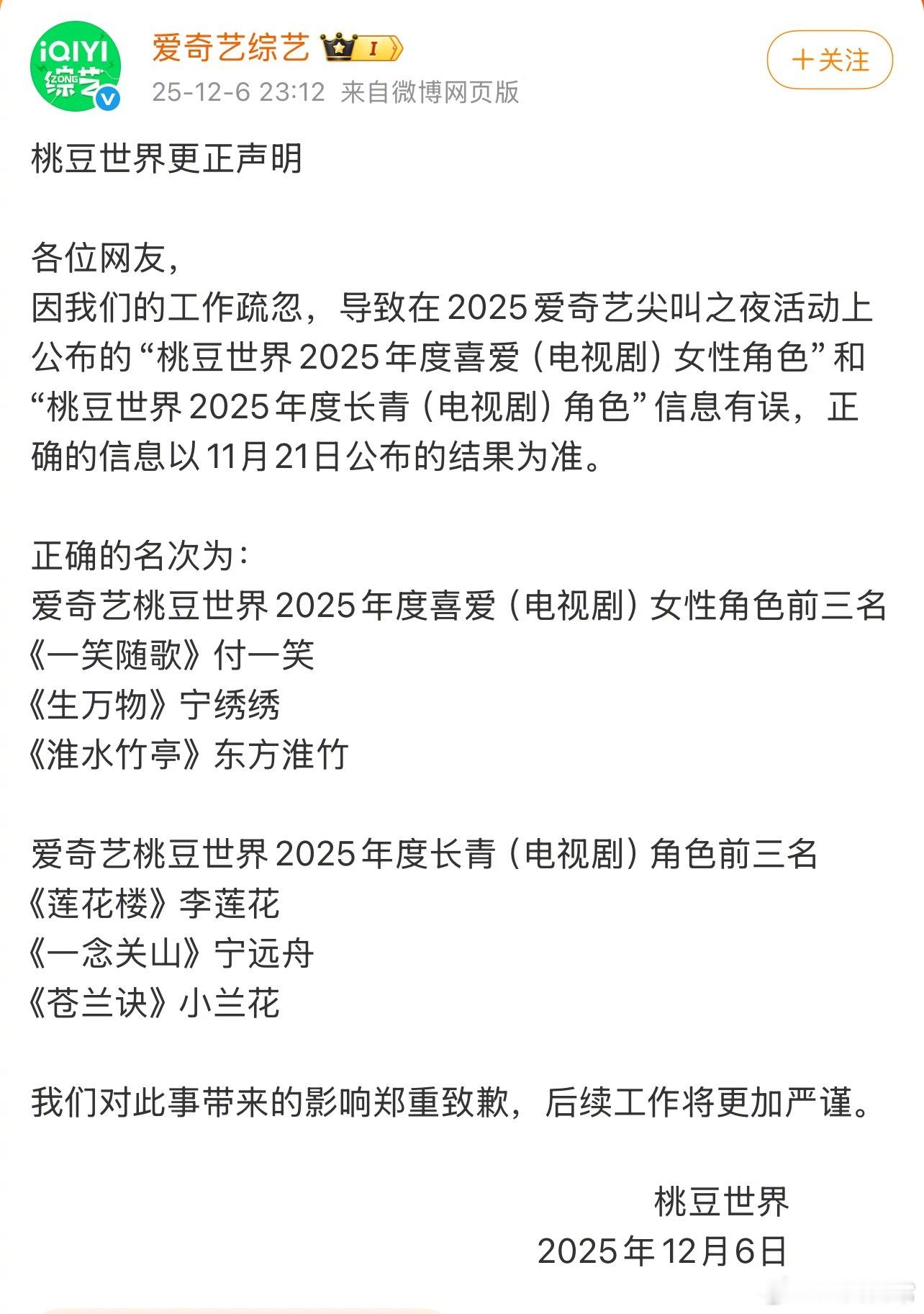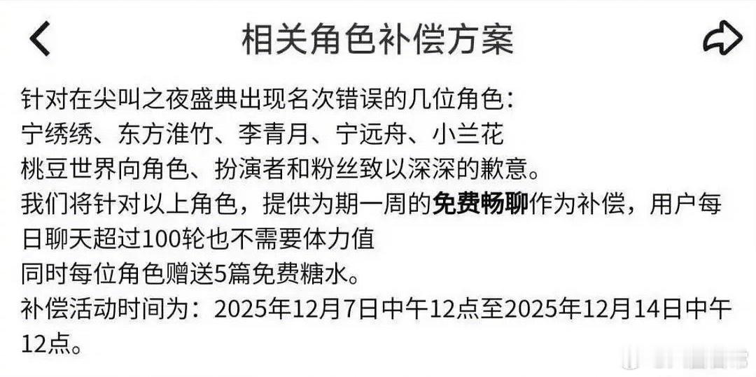 爱奇艺尖叫之夜名次错误的补偿方案就是可以跟这些角色免费畅聊一周爱奇艺道歉