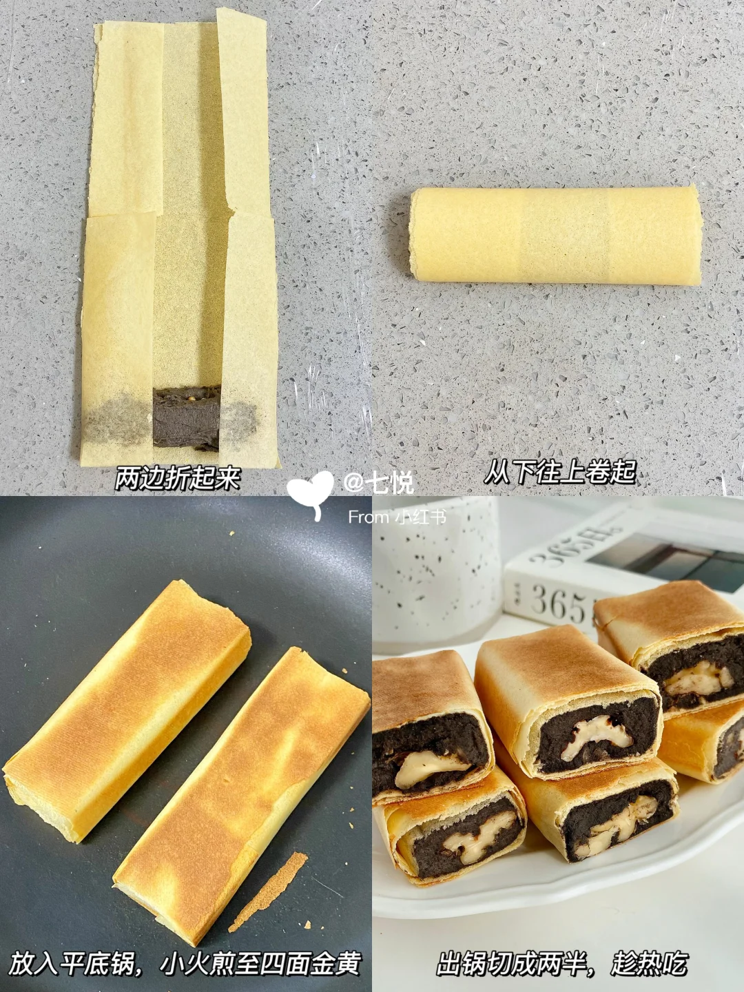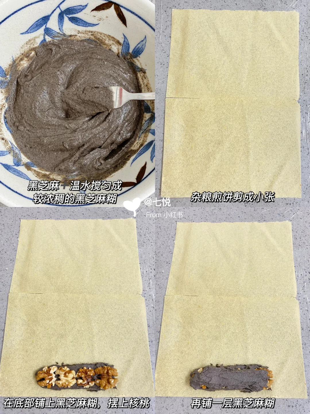 超好吃的脆皮黑芝麻核桃煎饼 酥脆的饼皮+浓香的黑芝麻糊+香脆的核桃仁 👍这个搭配真的很养生有木有~ 快点试试吧[派对R] - 🌿食材: 黑芝麻粉 核桃仁 杂粮煎饼 - 🌿做法: 1️⃣黑芝麻粉+温水搅匀成较浓稠的黑芝麻糊 2️⃣杂粮煎饼剪成小张,在底部铺上黑芝麻糊,摆上核桃,再铺一层黑芝麻糊 3️⃣把煎饼两边折起来,从下往上卷起 4️⃣放入平底锅中,小火煎至四面金黄,出锅切成两半,趁热吃很酥脆