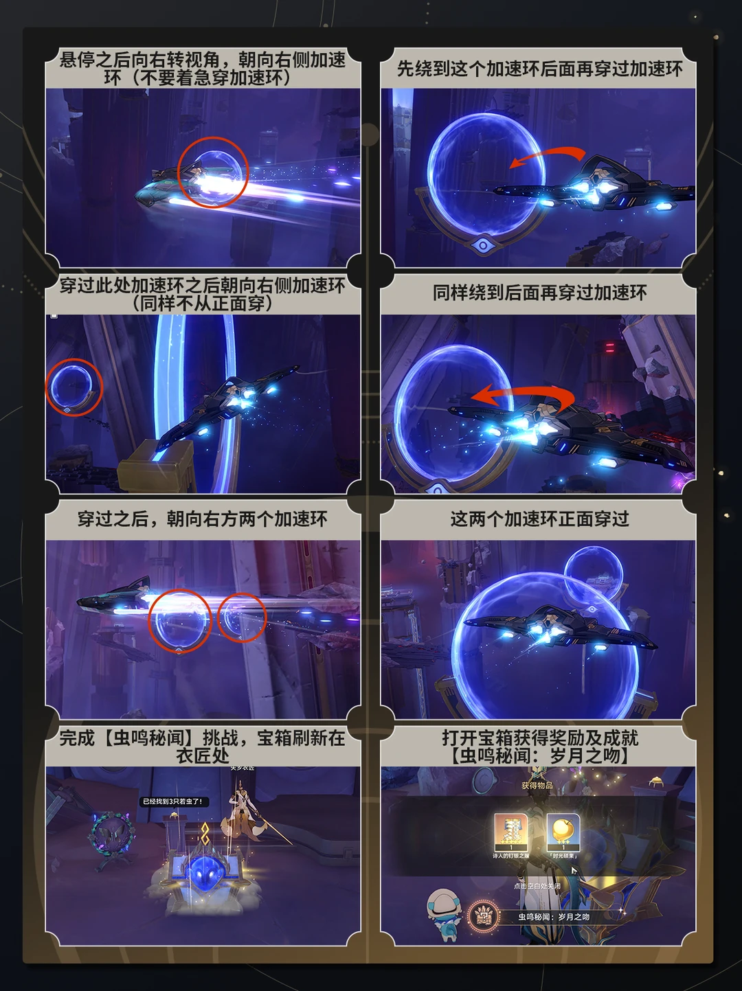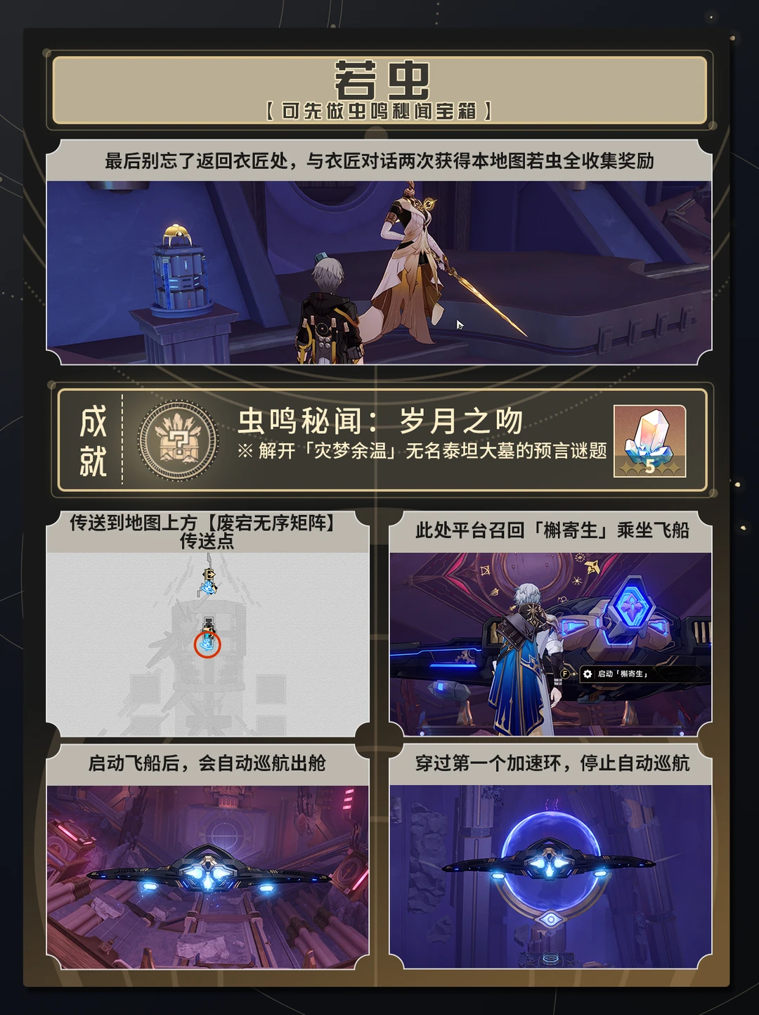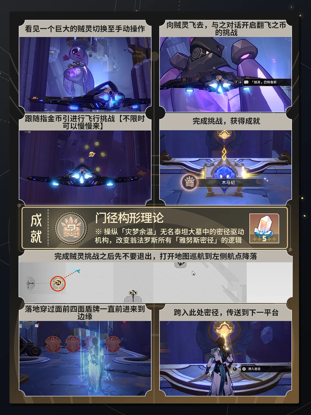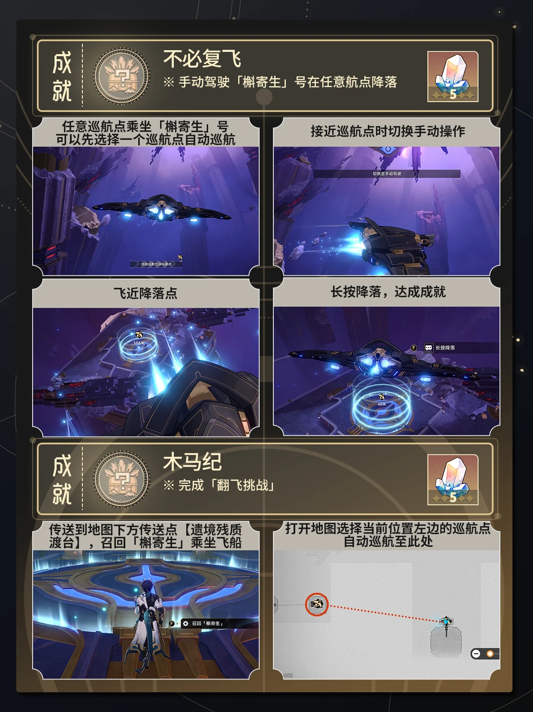 uid:13002308 【若虫】 可先往后翻几页先做虫鸣种闻宝箱 【不必复飞】 手动驾驶「槲寄生」号在任意航点降落 【木马纪】 完成「翻飞挑战」 【门径构形理论】 操纵「灾梦余温」无名泰坦大墓中的密径驱动机构,改变翁法罗斯所有「雅努斯密径」的逻辑