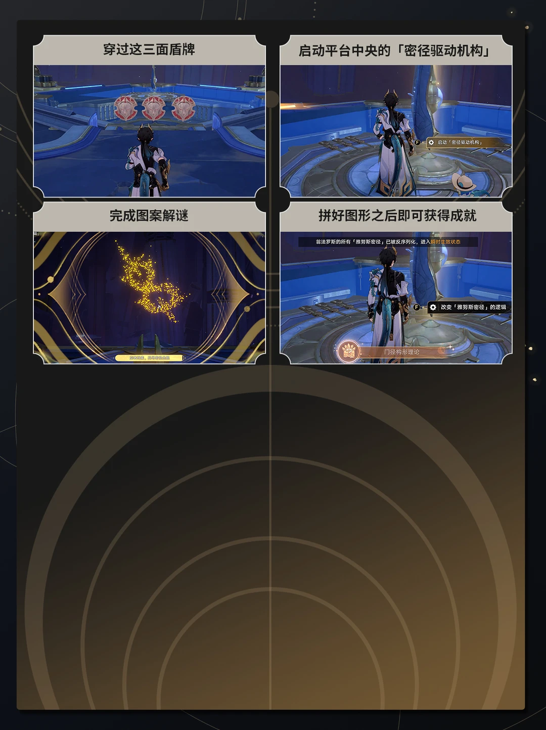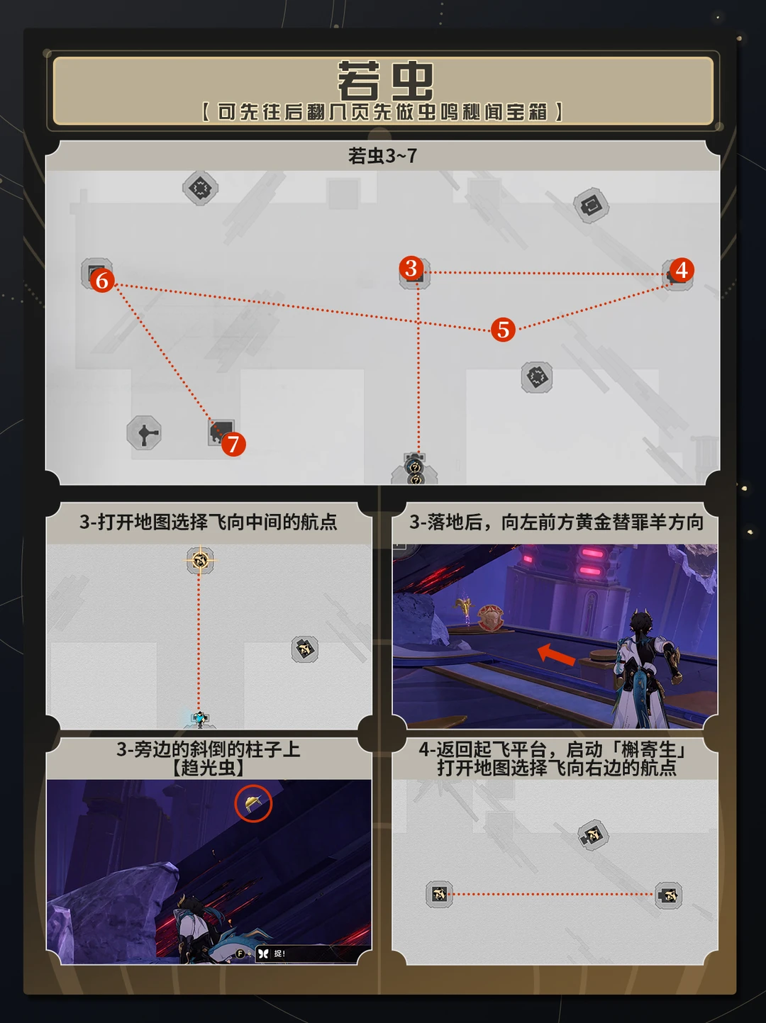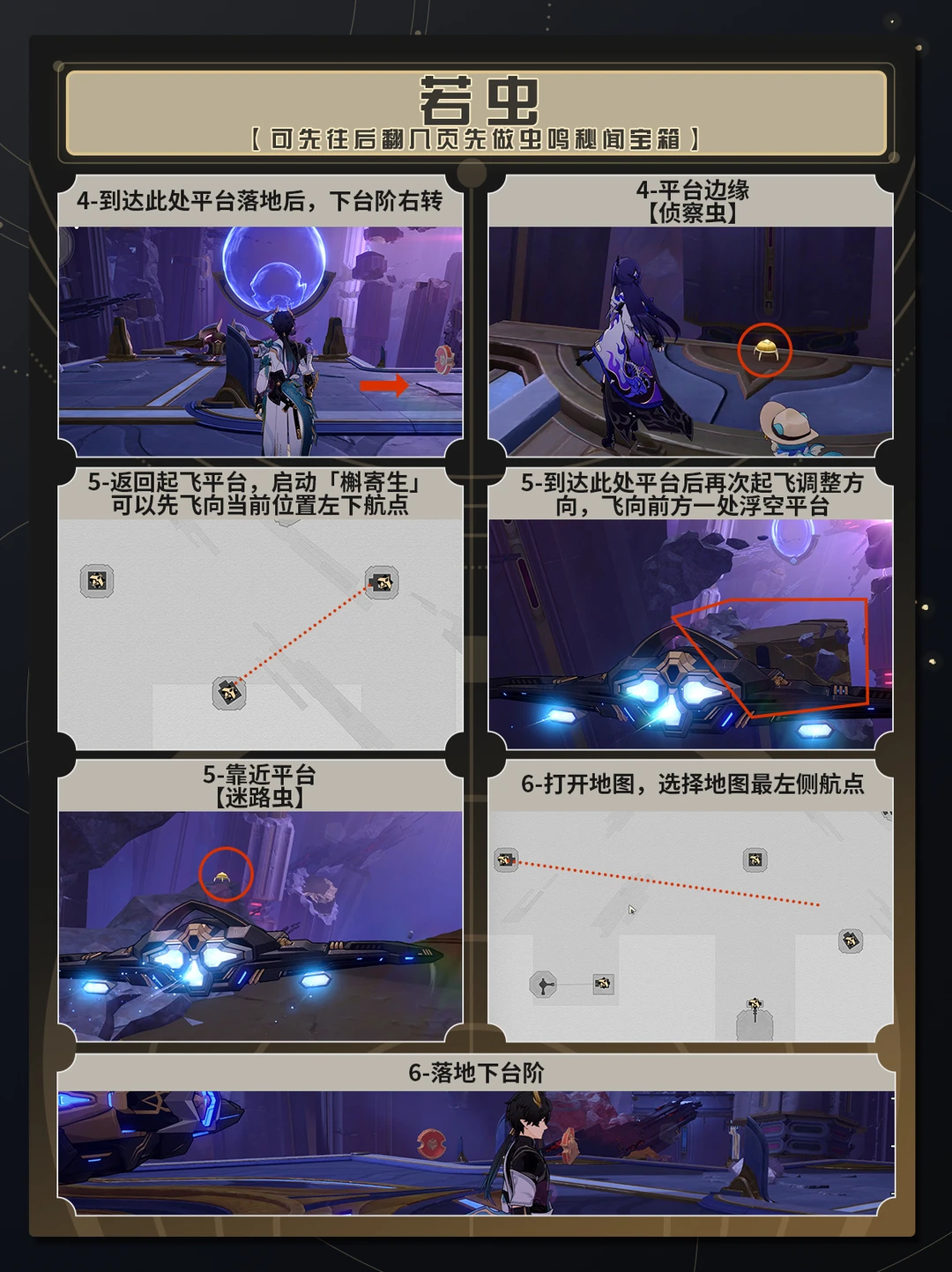 uid:13002308 【若虫】 可先往后翻几页先做虫鸣种闻宝箱 【不必复飞】 手动驾驶「槲寄生」号在任意航点降落 【木马纪】 完成「翻飞挑战」 【门径构形理论】 操纵「灾梦余温」无名泰坦大墓中的密径驱动机构,改变翁法罗斯所有「雅努斯密径」的逻辑