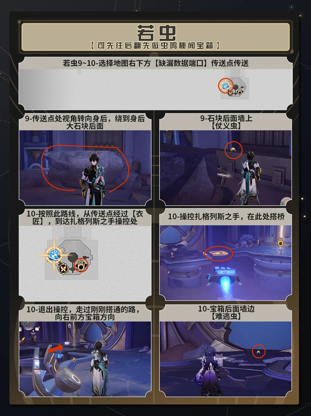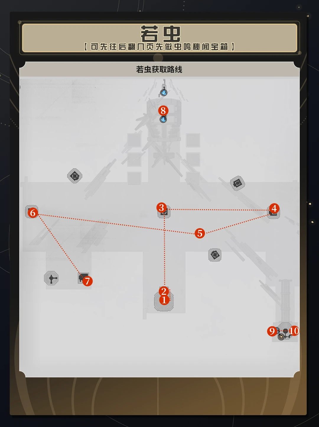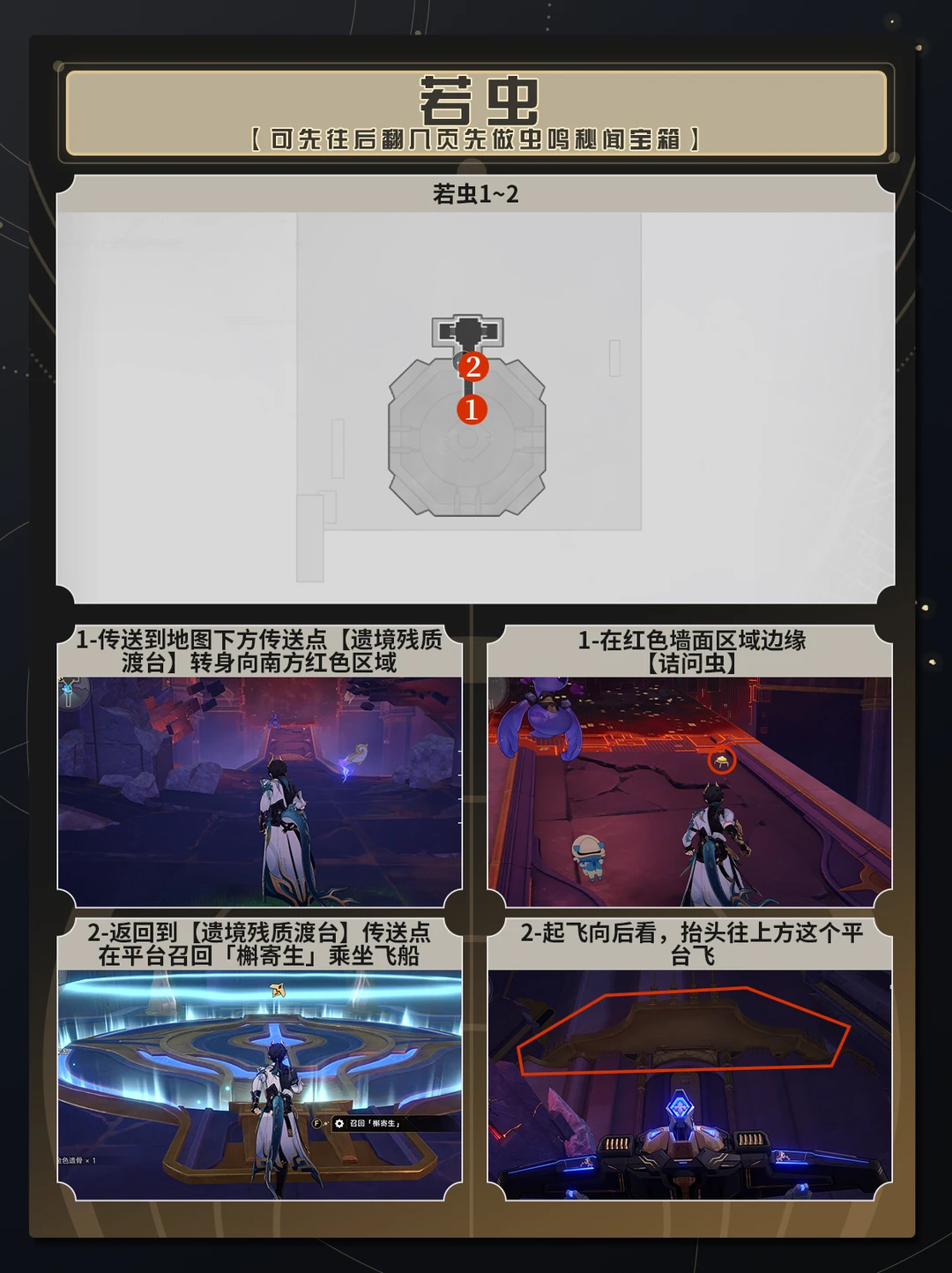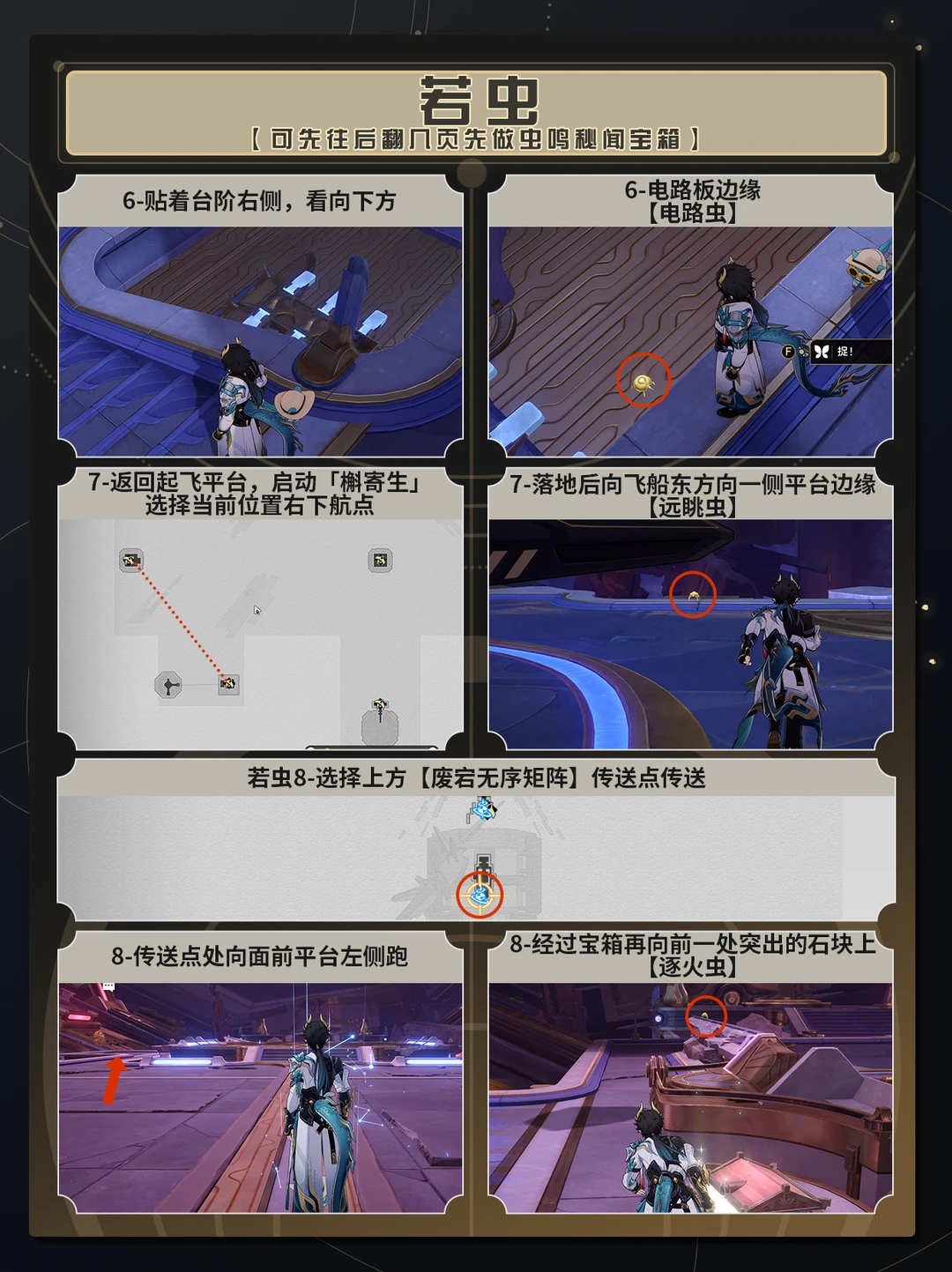 uid:13002308 【若虫】 可先往后翻几页先做虫鸣种闻宝箱 【不必复飞】 手动驾驶「槲寄生」号在任意航点降落 【木马纪】 完成「翻飞挑战」 【门径构形理论】 操纵「灾梦余温」无名泰坦大墓中的密径驱动机构,改变翁法罗斯所有「雅努斯密径」的逻辑