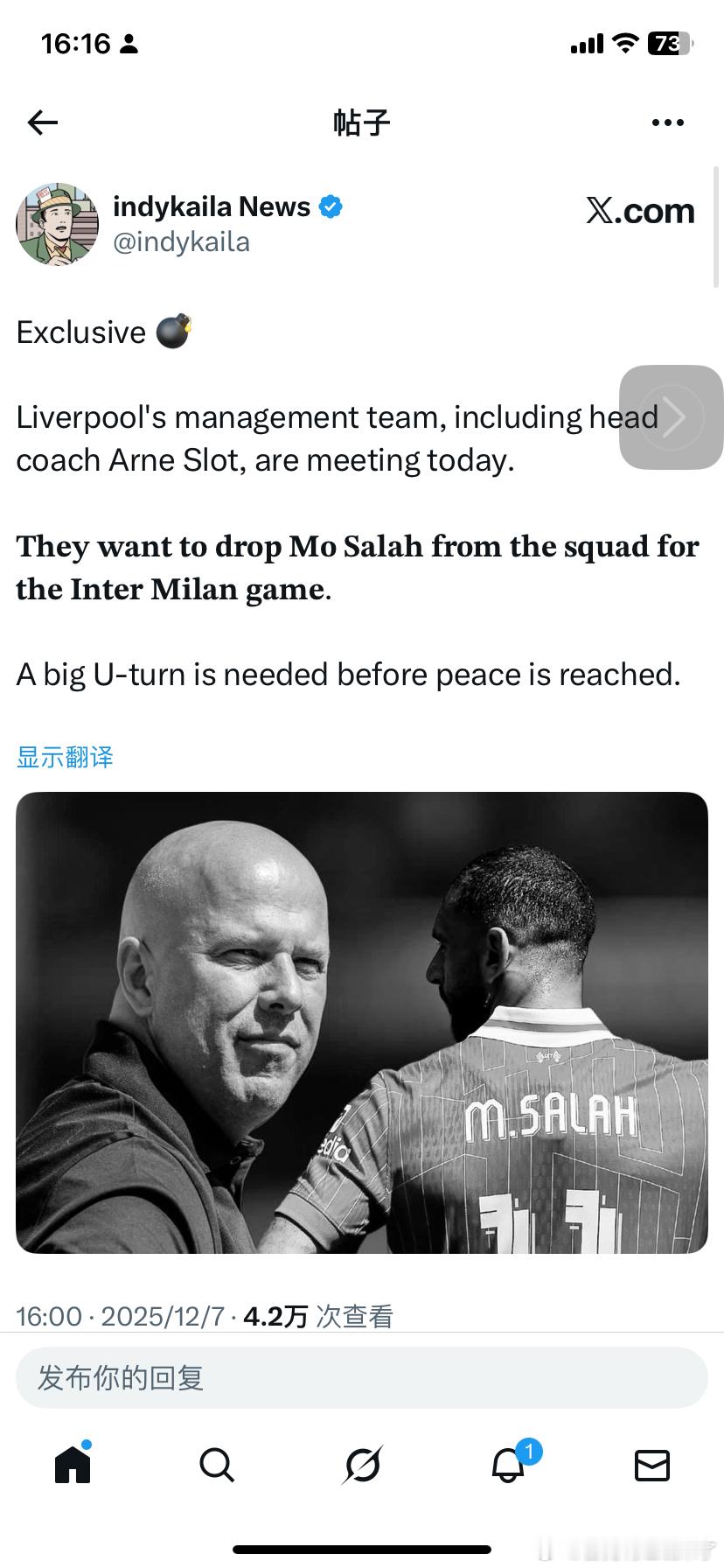 绿帽哥爆料利物浦管理层(包括主帅斯洛特)今日召开会议。报道称,他们计划在对阵国际米兰的比赛中弃用萨拉赫。若想双方达成和解,局势需要重大转折。