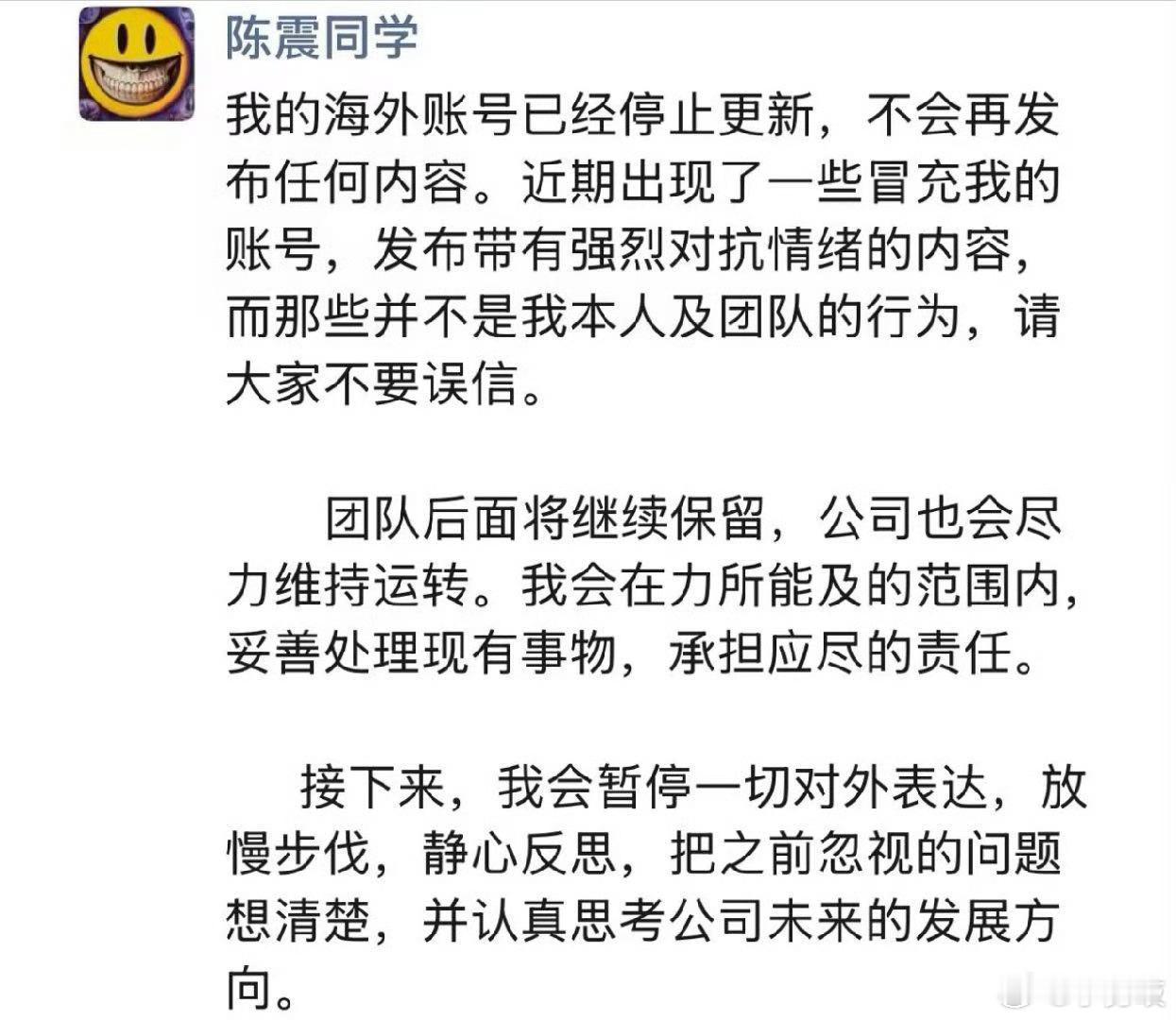 陈震在朋友圈最新发文:“我的海外账号已经停止更新,不会再发布任何内容。近期出现了一些冒充我的账号,发布带有强烈对抗情绪的内容,而那些并不是我本人及团队的行为,请大家不要误信。团队后面将继续保留,公司也会尽力维持运转。我会在力所能及的范围内,妥善处理现有事物,承担应尽的责任。接下来,我会暂停一切对外表达,放慢步伐,静心反思,把之前忽视的问题想清楚,并认真思考公司未来的发展方向。”大家一起来感受下,你受的了吗?陈震朋友圈发文陈震称有人冒充其账号