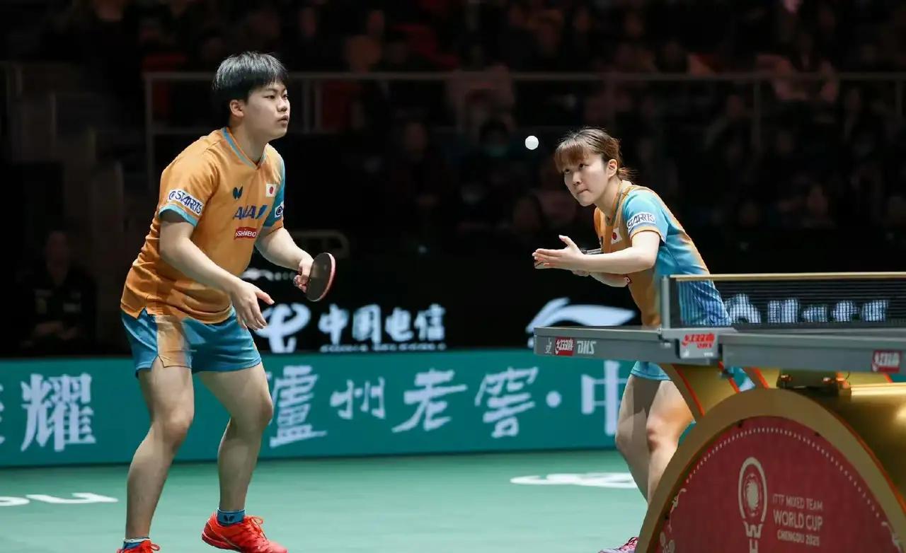 成都混合团体赛世界杯决赛,正在紧张激烈的比赛中,中国队一日本队。 第一盘莎头组合3一0松月组合 莎头为团队拿下3分,太棒了。 第二盘王曼昱一张本美和,曼昱加油。 第三盘林诗栋一张本智和,小石头不要有压力兴奋起来,狠狠的打张本智和,加油加油。 争取3盘结束。 日本队还是相信张本智和兄妹,让他们兄妹上单打。