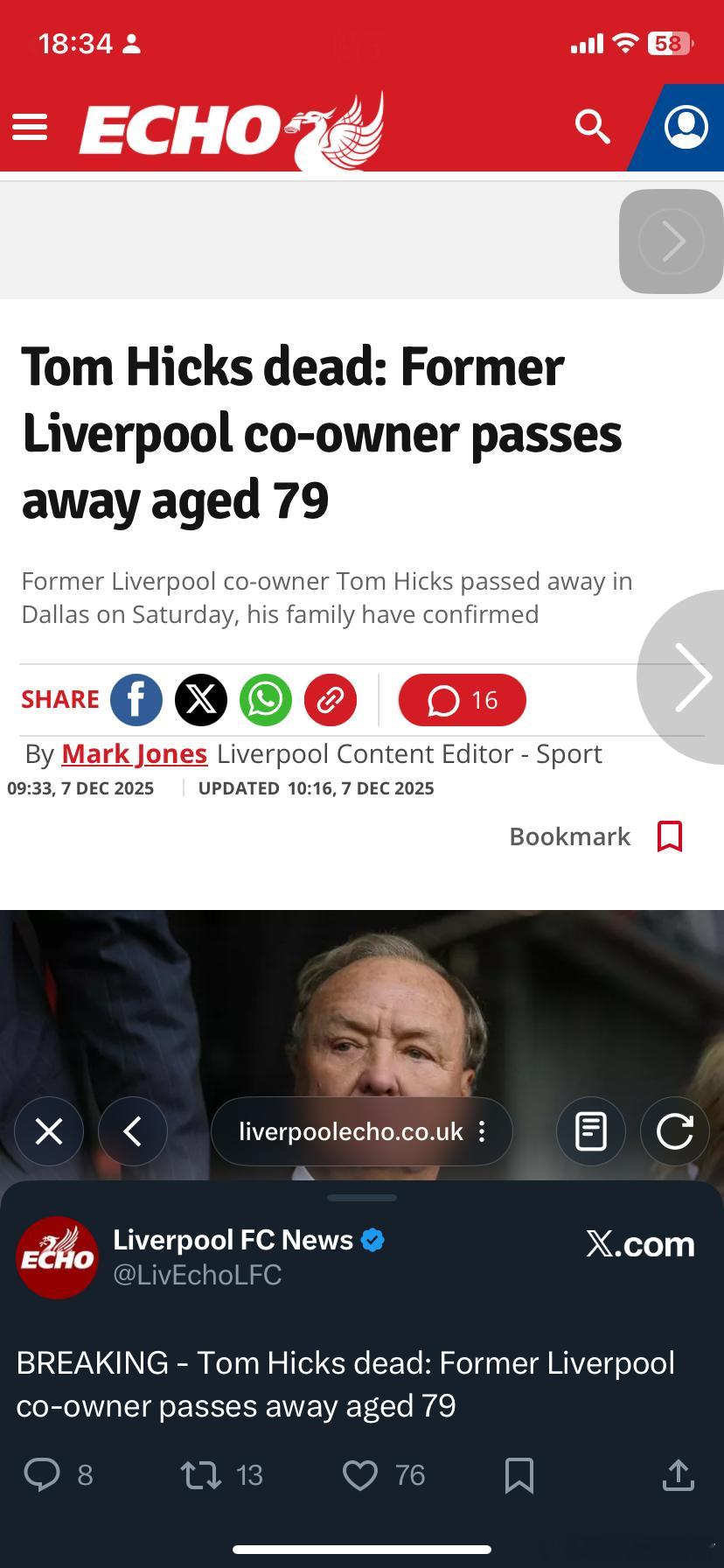 利物浦前老板汤姆·希克斯逝世,享年79岁。希克斯于2007年与商业伙伴乔治·吉列特共同收购利物浦足球俱乐部50%的股份。然而,在执掌俱乐部期间,他们的管理极度不得人心,最终因俱乐部财务前景日益加剧的担忧及潜在的破产托管风险,于2010年被迫将利物浦出售给芬威体育集团。