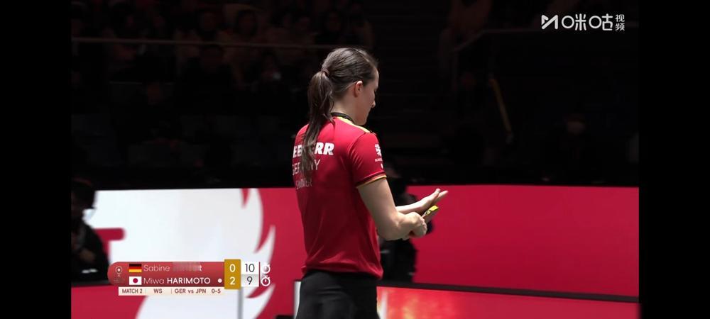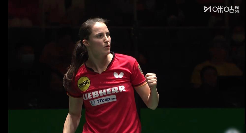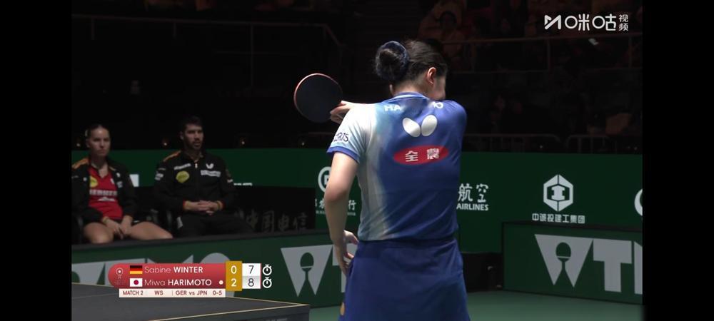 乒乓球混合团体世界杯第二场决胜局女单比赛,德国队女将温特和日本队张本美和打得很接