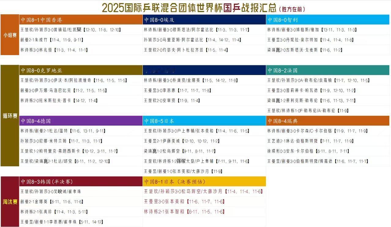 【夺冠历程回顾!国际乒联混合团体世界杯收官,国乒战绩一张图看完!】 循环赛车轮战最煎熬,国乒丢掉的局分基本都在循环赛后三场丢打日本、韩国和瑞典丢的。 以8-1胜中国香港开局,以8-1胜日本收官!