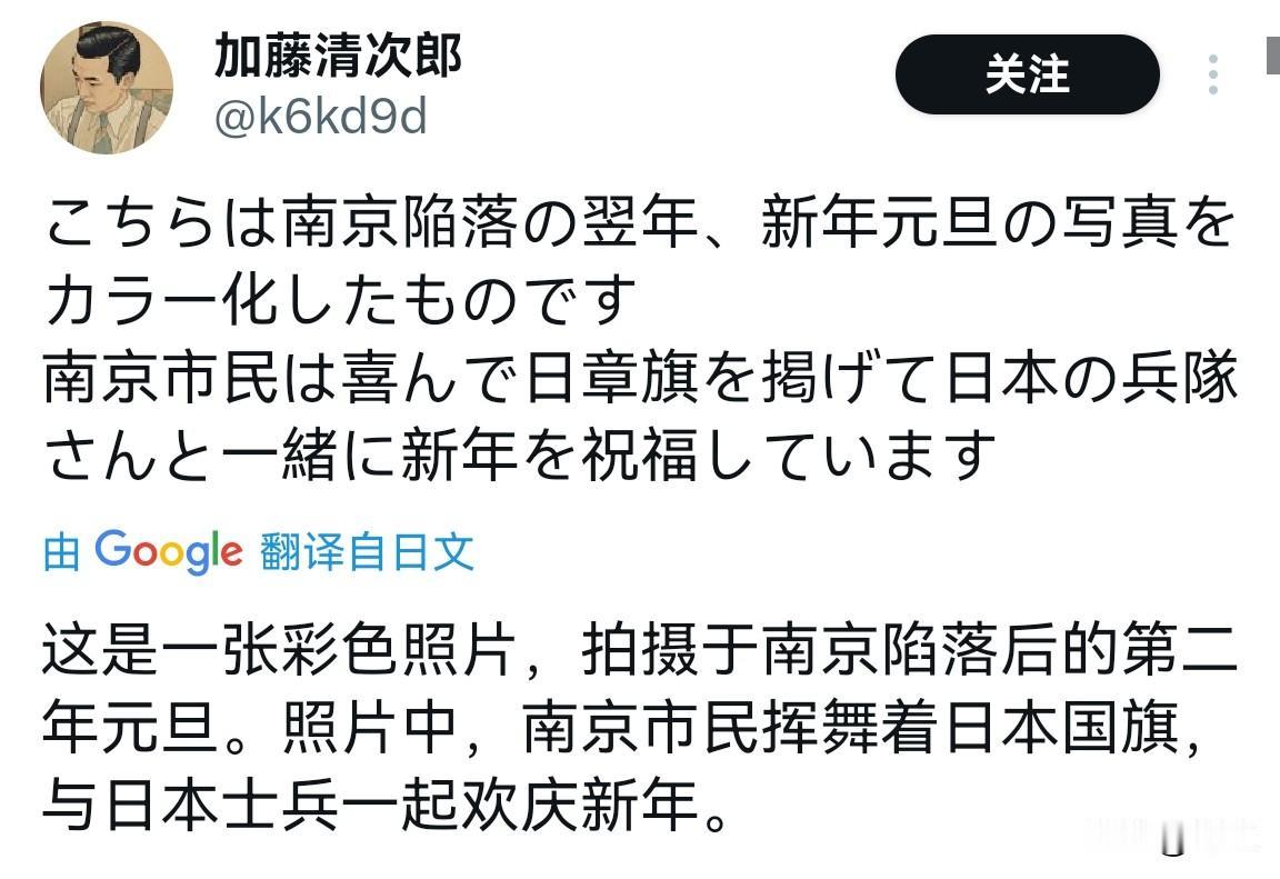 这就是日本人,真是世界上唯一“不知道”日本在南京做了什么的就是他们! 这个日本人声称“南京市民与日本兵一起欢庆新年”,他把这当成历史证据,但这是对历史真相的侮辱! 事实是:这是一张在占领下的摆拍照,笑容不过是枪口下想要生存的无奈!当时的安全区有20万难民,数万名妇女遭蹂躏后毁尸灭迹,江东门、雨花台、幕府山等地有大量集体墓,拉贝写日记时手都是颤抖的! 图片可以上色,但是历史罪证无法变得清白! 注:图2是上色后的图片,图3是原图。