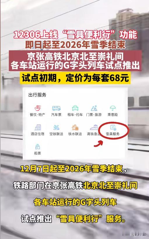 ❄️崇礼雪友狂喜!京张高铁雪具可随车带,预约攻略速藏 扛雪板赶高铁累到直喘?托运等半天还怕磕坏?崇礼雪友别愁!京张高铁刚上线的新服务,直接解决你的出行难题❄️ 12月7日起至2026年雪季结束,京张高铁北京北至崇礼间的8趟G字头列车,正式试点“雪具便利行”。不用再拆分雪具,也不用挤行李架——在12306买完指定车次车票后,直接点购票页的“雪具便利行”预约就行。 划重点!雪具长宽高总和不超200厘米都能办,预约成功后走专用安检通道,上车有改造后的专属存放区,工作人员还会定时巡查护安全。试点初期每套68元,开车前1小时取消能全额退款,超灵活。 本以为超200厘米的雪具只能认命托运,没想到反转来了:“雪具快运”服务还在!不想随车带的话,照样能通过12306预约,实现雪具先到雪场等你。 这个雪季去崇礼,1小时高铁+雪具随身带,再也不用为装备折腾。你会选随车带雪具,还是更爱雪具快运?评论区聊聊你的滑雪出行妙招~ 京张高铁雪具便利行 崇礼滑雪攻略