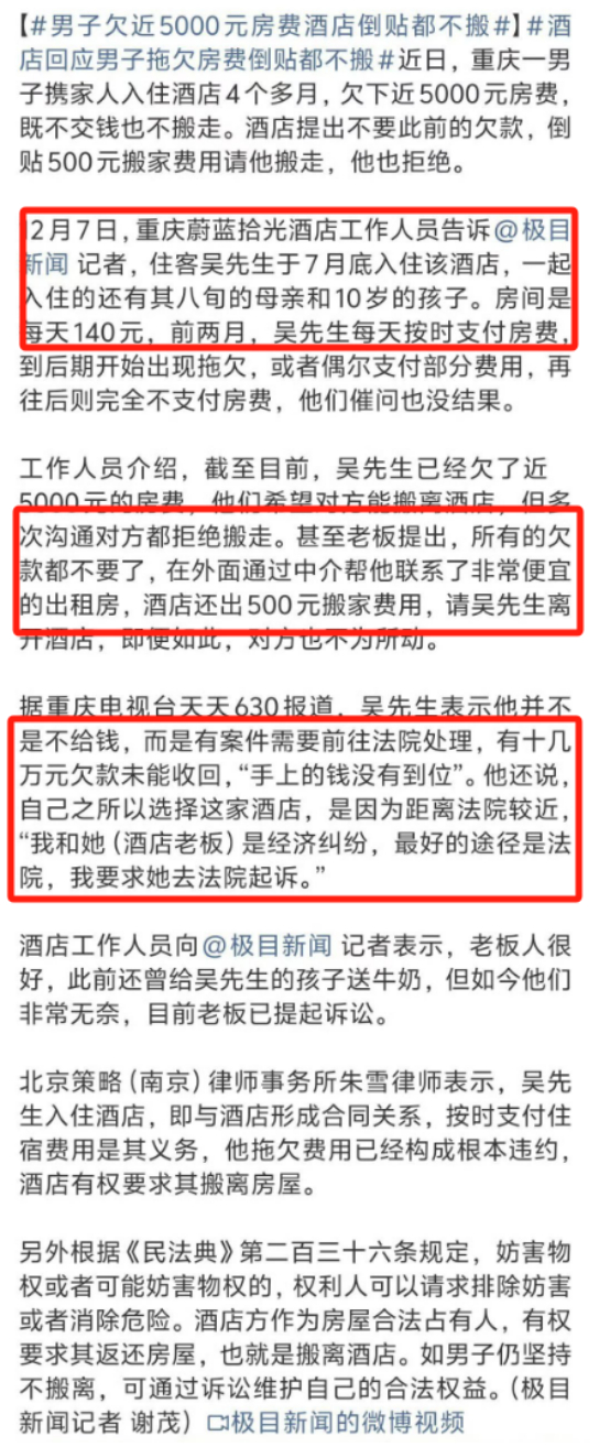 男子欠近5000元房费 酒店倒贴都不搬 真是给他好脸儿了,别人欠他钱,他欠酒店钱,赖着不走就是因为离法院近,还让酒店也起诉他。欠钱的是大爷,这话没跑儿......