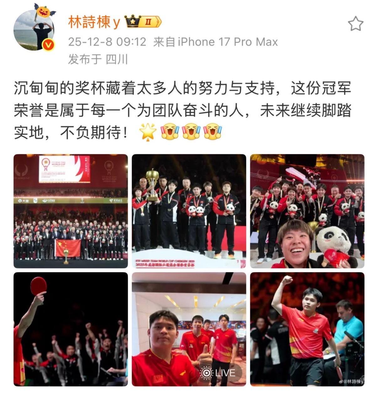 林诗栋发文总结成都混团世界杯夺冠:“沉甸甸的奖杯藏着太多人的努力与支持,这份冠军荣誉是属于每一个为团队奋斗的人,未来继续脚踏实地,不负期待!”林诗栋总结成都混团世界杯 回顾国乒混团世界杯夺冠路