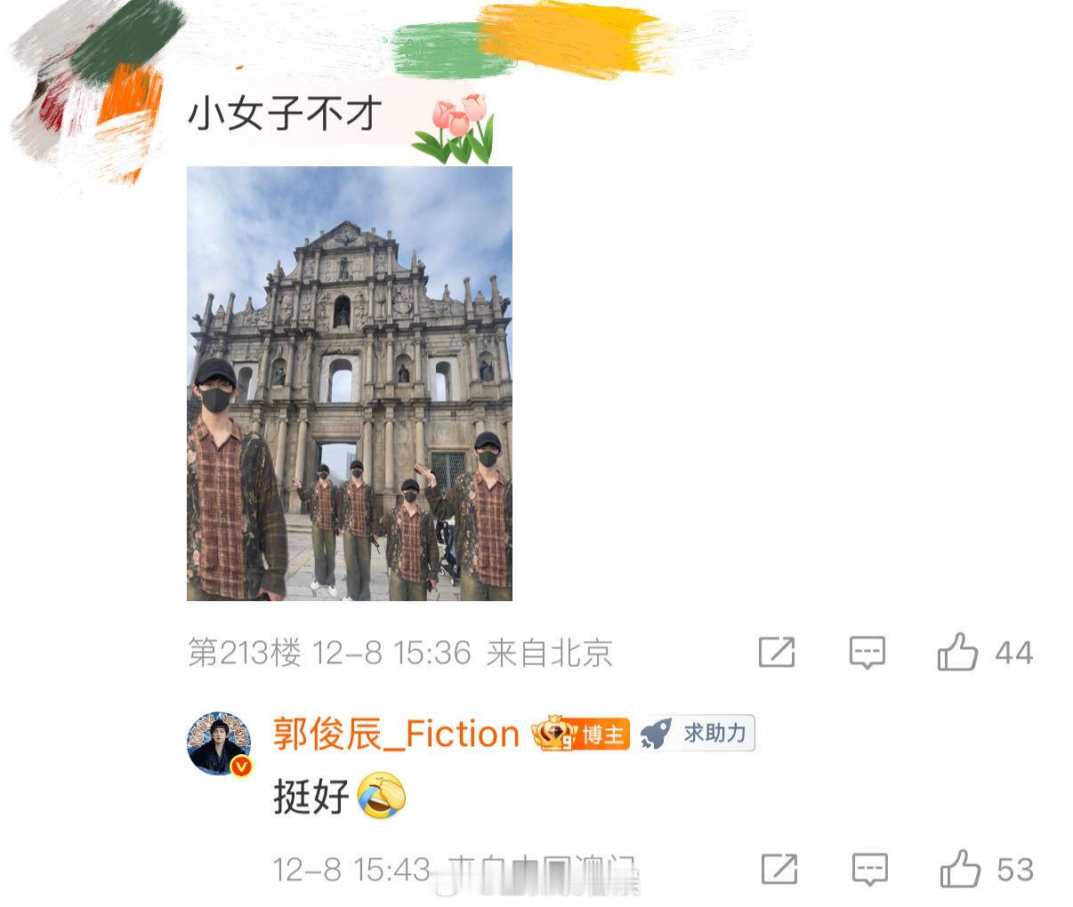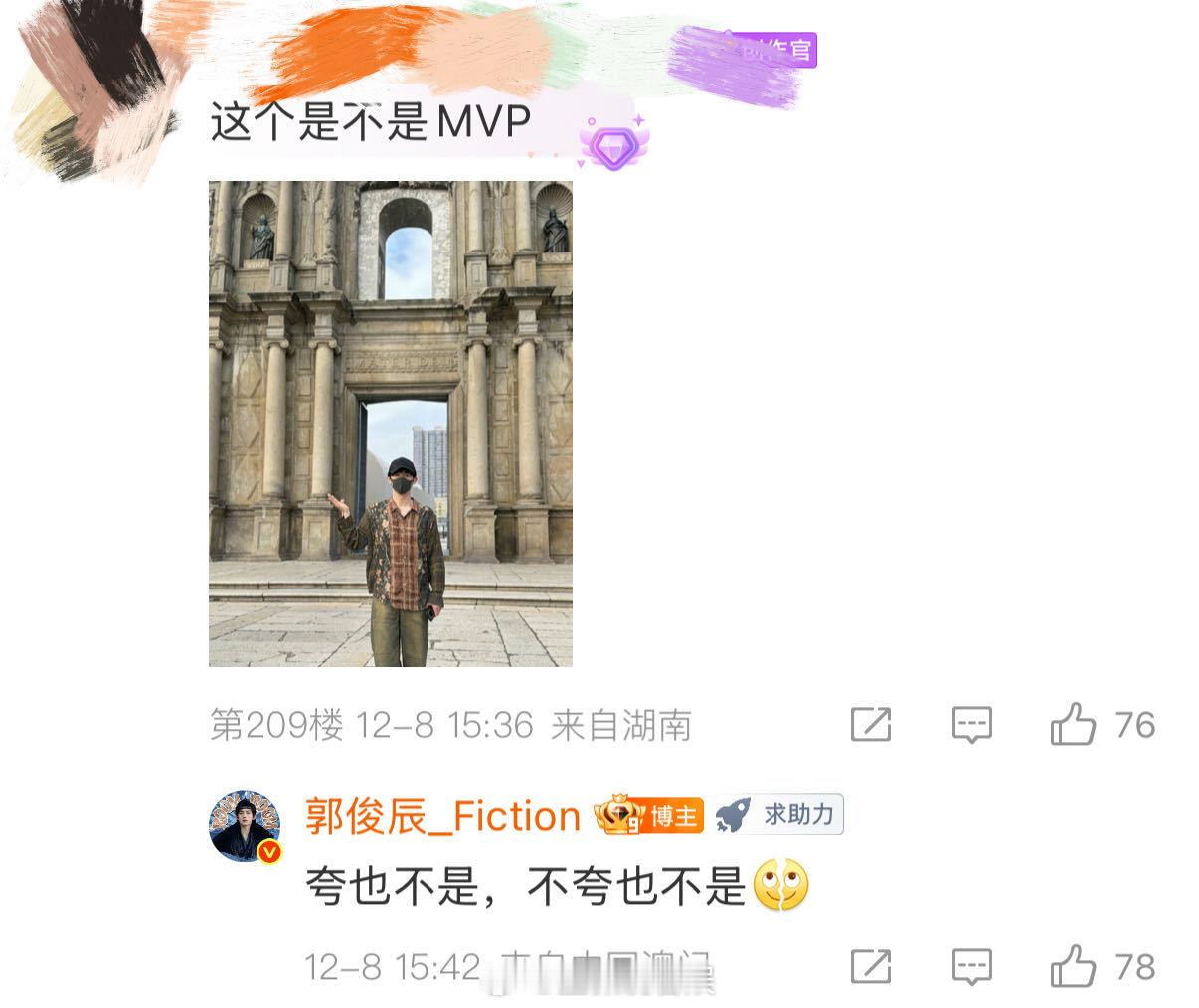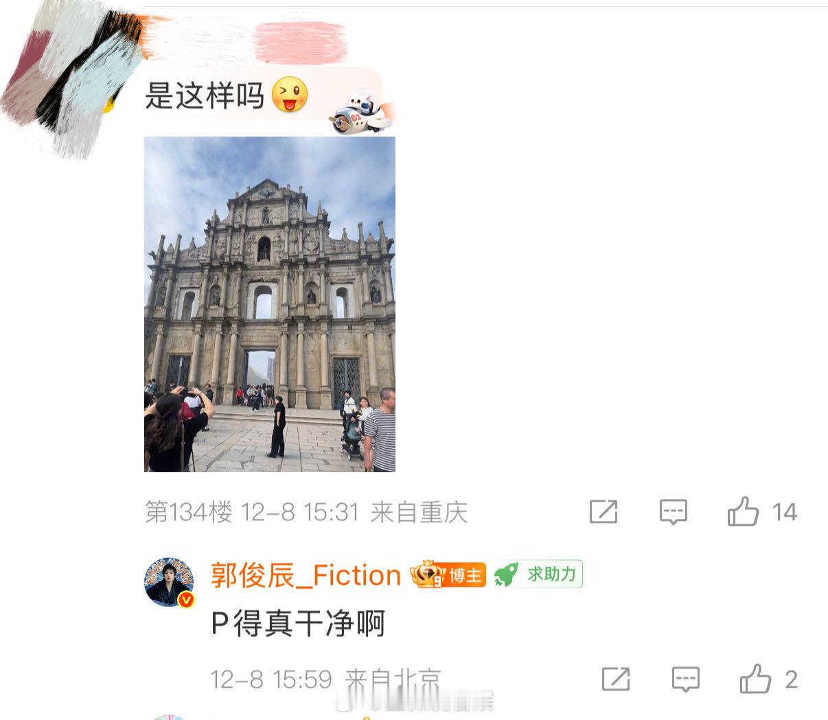 郭俊辰P得真干净 同一个世界同一个游客打卡照!很难想象前一晚以非常帅气的造型领了奖,结果第二天打卡拍游客照遇到P图难题,还求助了广大网友😂果不其然这届网友是会给郭俊辰捣乱的,一次主动提问换来郭俊辰终生内向~郭俊辰