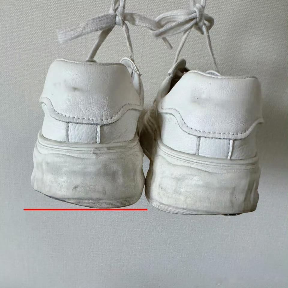 足弓塌陷 既然今天讲了鞋,那不得不翻出这张经典的图,来自于扁平足同事的鞋,你们会不会也磨损到这个程度