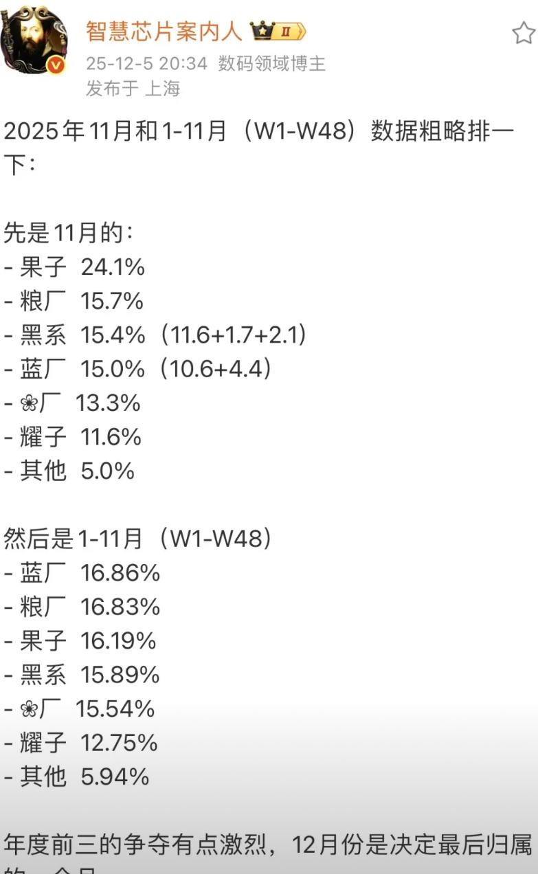 最后则是苹果,今年的iphone 17系列可以说是相当成功,销量持续走高,全年份额也没有拉开太多差距,还是有希望冲一冲。