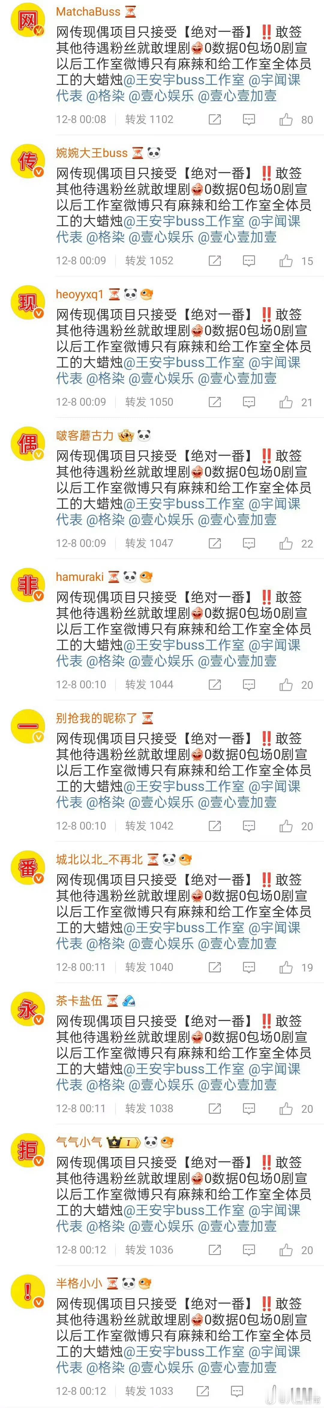 对于网传的章若楠、王安宇将合作现偶《你那儿几点》,王安宇粉丝排字:非一番永拒