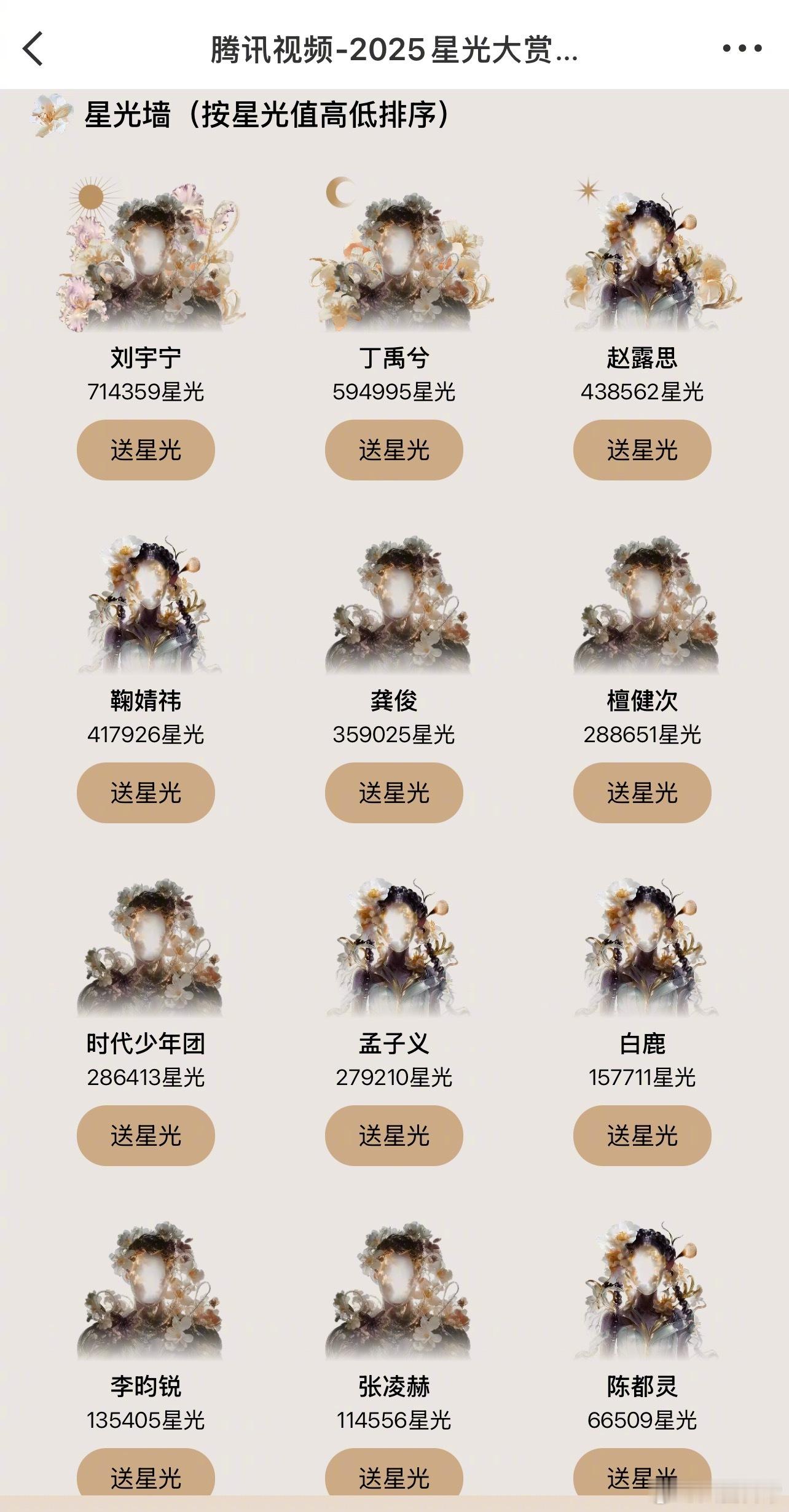 星光大赏星光墙实时排名前十:刘宇宁、丁禹兮、赵露思、鞠婧祎、龚俊、檀健次、时代少年团、孟子义、白鹿、李昀锐