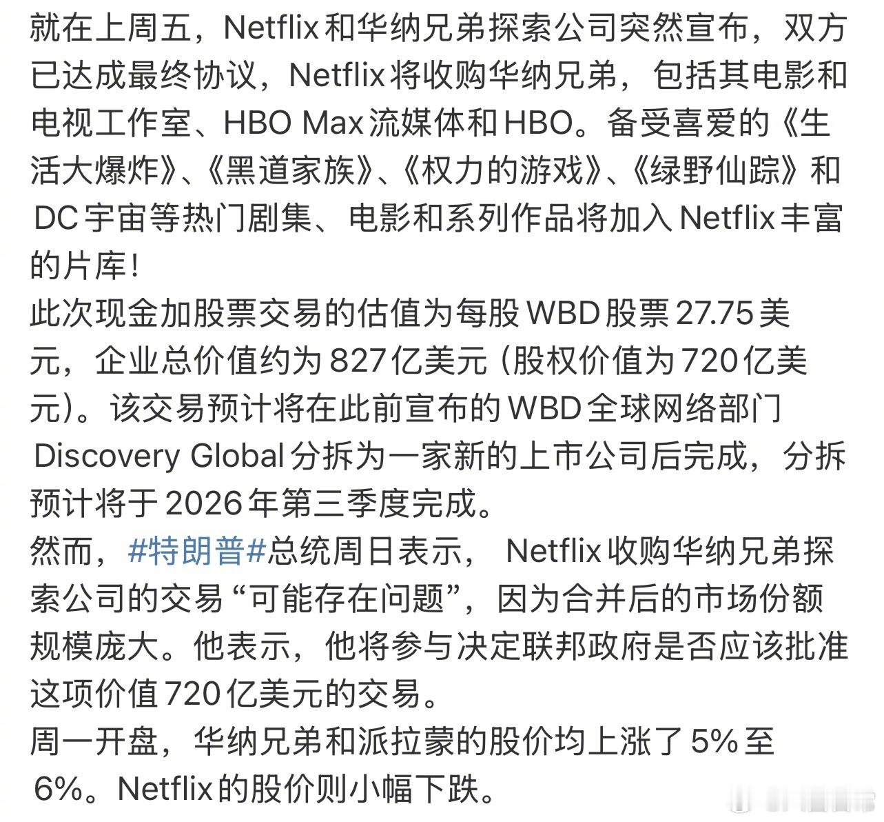 派拉蒙提出1080亿美元恶意收购华纳兄弟,挑战网飞前几天刚达成的720亿美元收购协议派拉蒙提出以每股30美元的现金价格,总计1084亿美元(约合人民币7554亿元)收购华纳整个企业网飞宣布以现金加股票估值每股27.75美元的价格,总计720亿美元(约合人民币5090亿元)收购华纳旗下电影制片厂及HBO Max流媒体业务