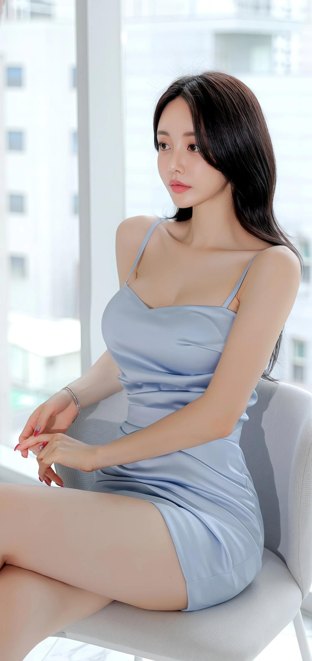 都市时尚女郎,浅蓝色连衣裙,优雅气质,都市风范。