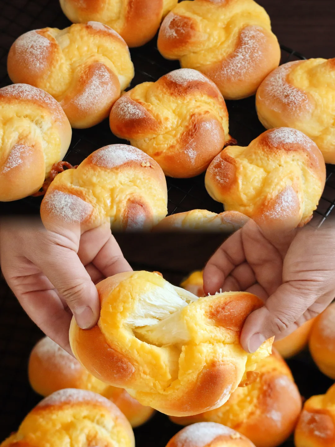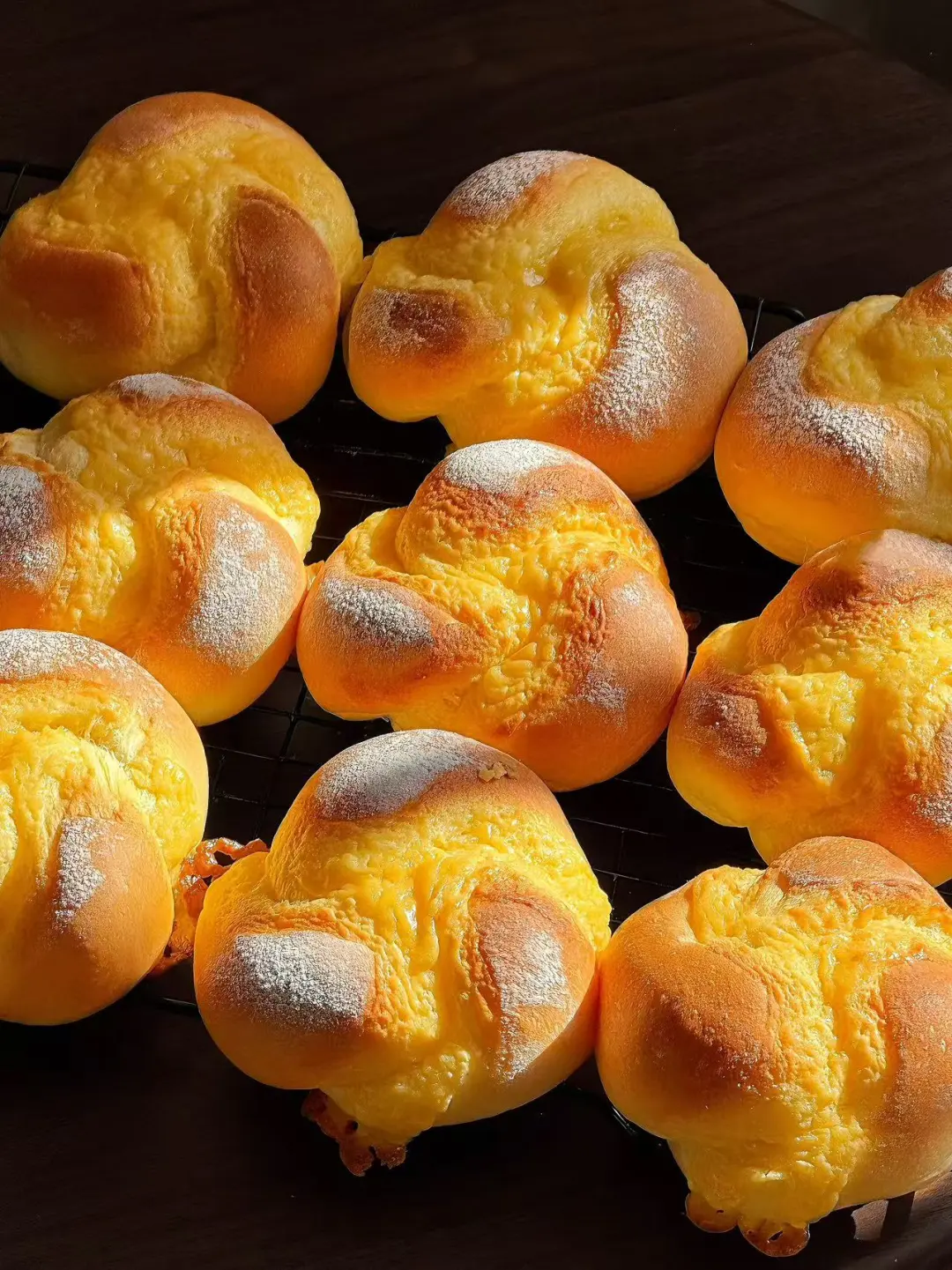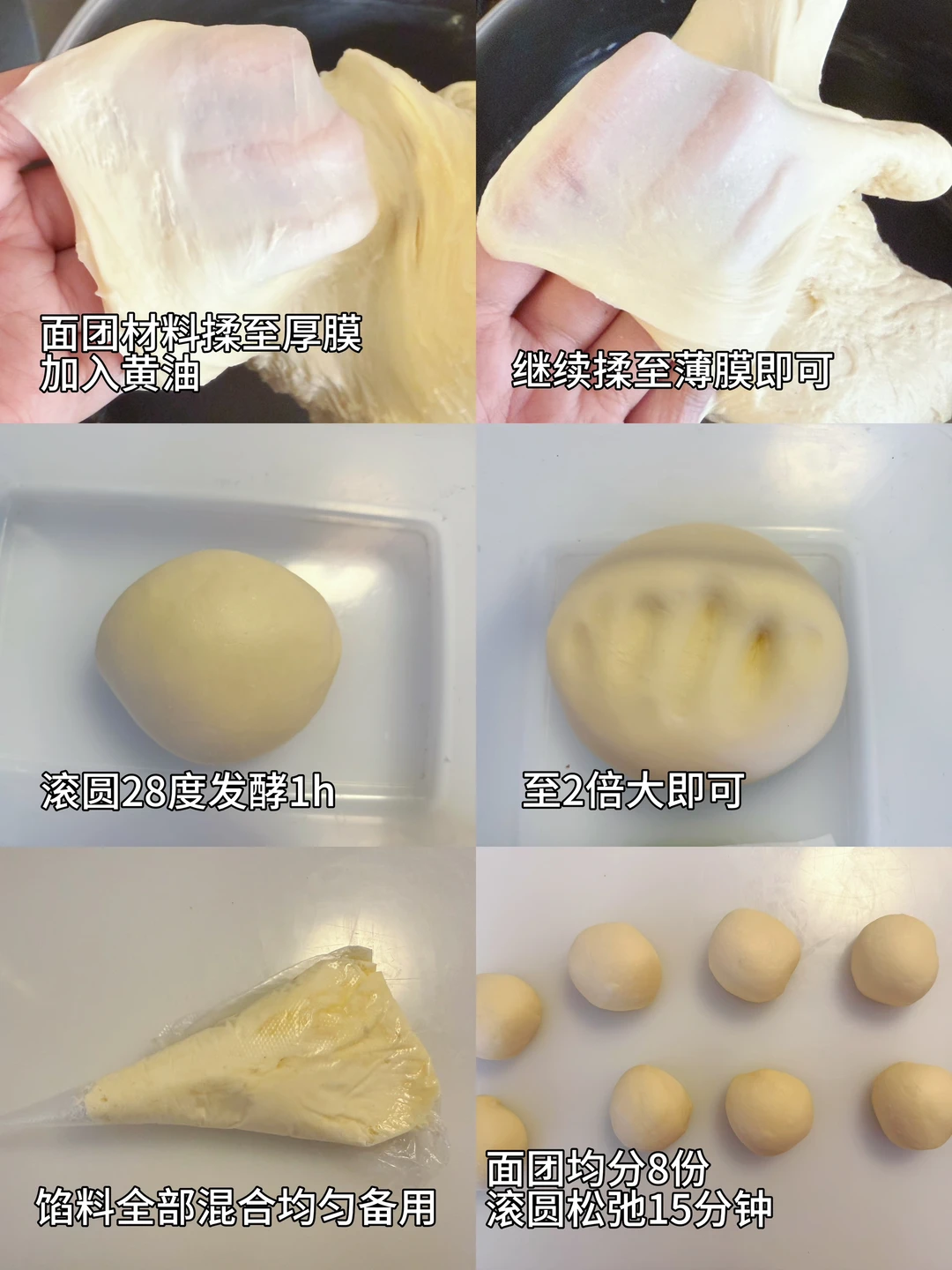 面团🥣:高筋面粉250g|耐高糖干酵母2.5g|盐3g|糖30g|奶粉10g|全蛋液25g|牛奶160g|炼乳30g|黄油20g