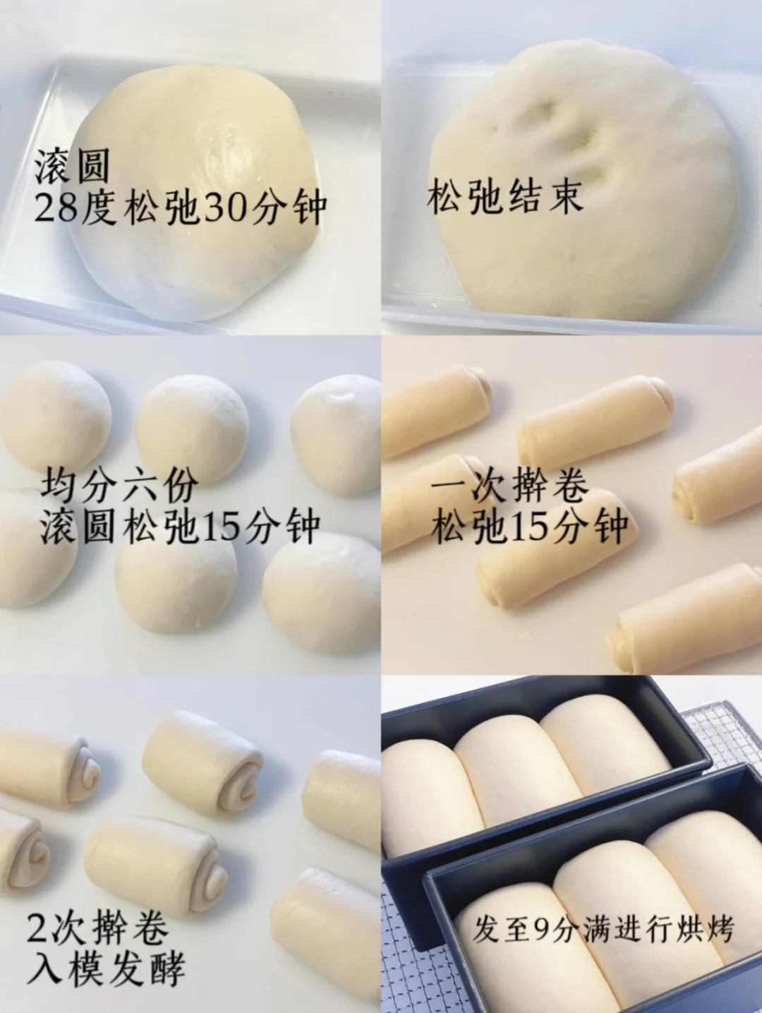5⃣️一次擀卷,继续松弛20分钟;二次擀卷,3个一组入模,35度/80湿度发酵至9分满