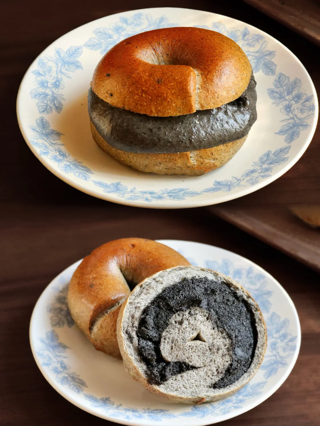 🥣贝果:高筋面粉250g|黑芝麻粉50g|牛奶130-140g(看情况加)|波兰种全部|干酵母2.5g|盐3g|(可不加:糖10g+椰子油15g)