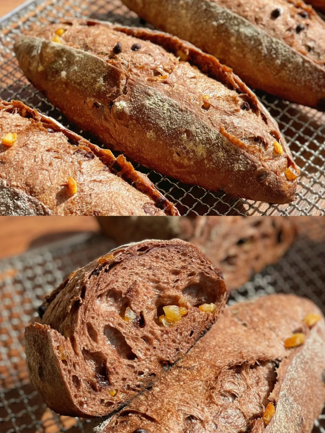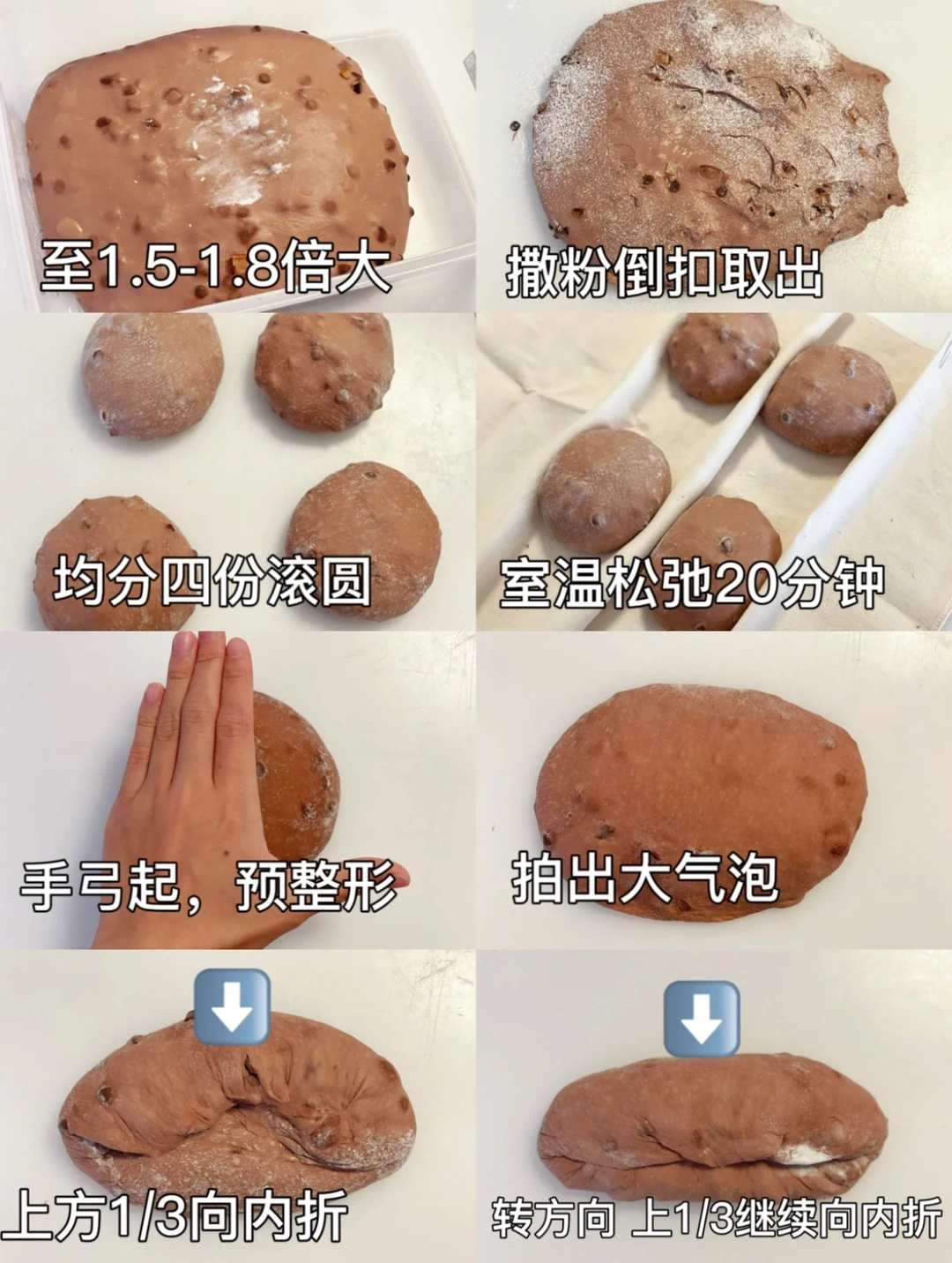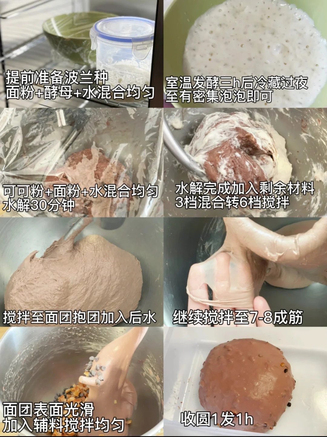 🥣主面团:高筋面粉230g|低筋面粉100g|干酵母1g|海盐6g|可可粉15g|水200g|后加水20g(如果面团太湿则不加)