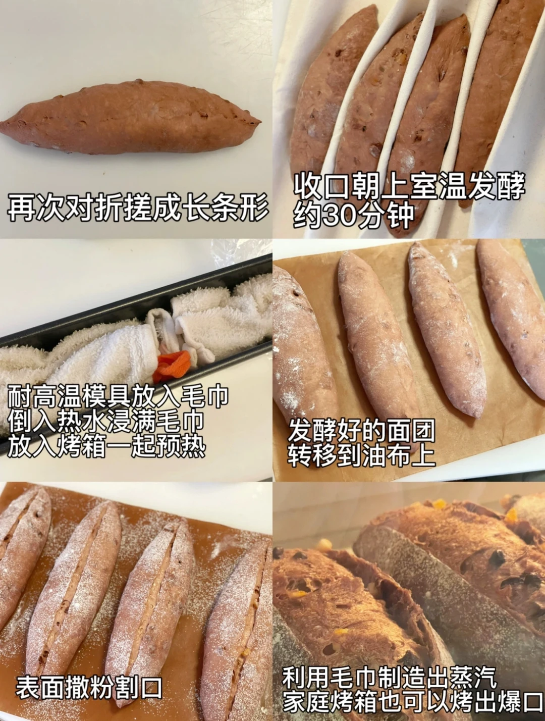 7⃣️轻轻将面团转移到油布上,表面撒粉割口;再将油布滑到烤箱里,230度烘烤16-18分钟,10分钟时将毛巾盒取出,请随时观察上色