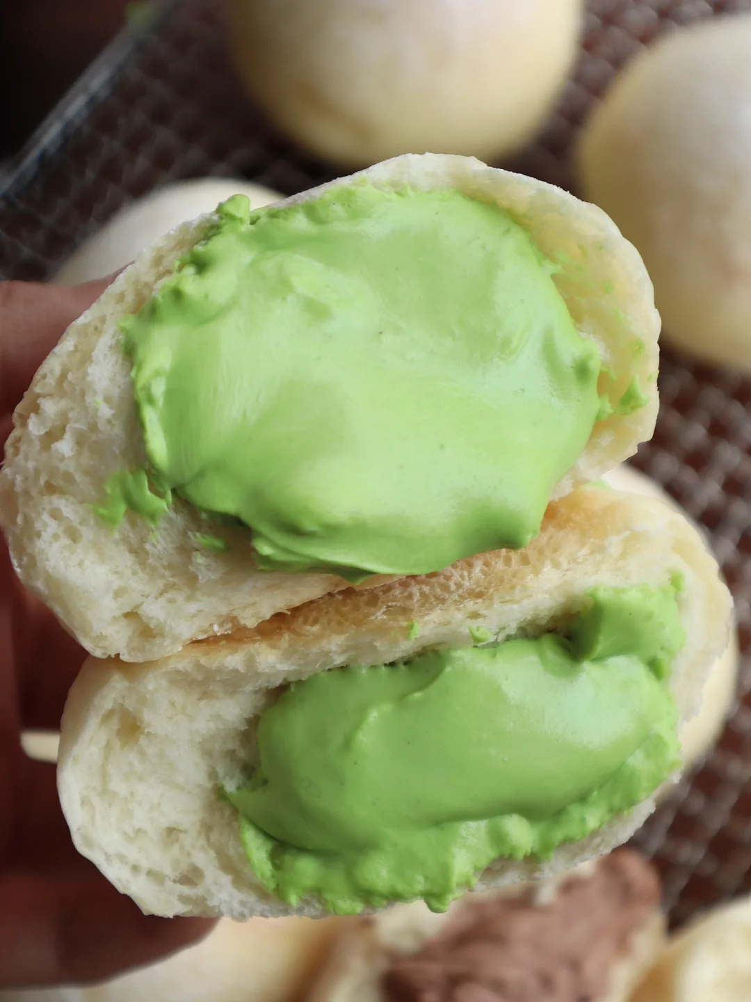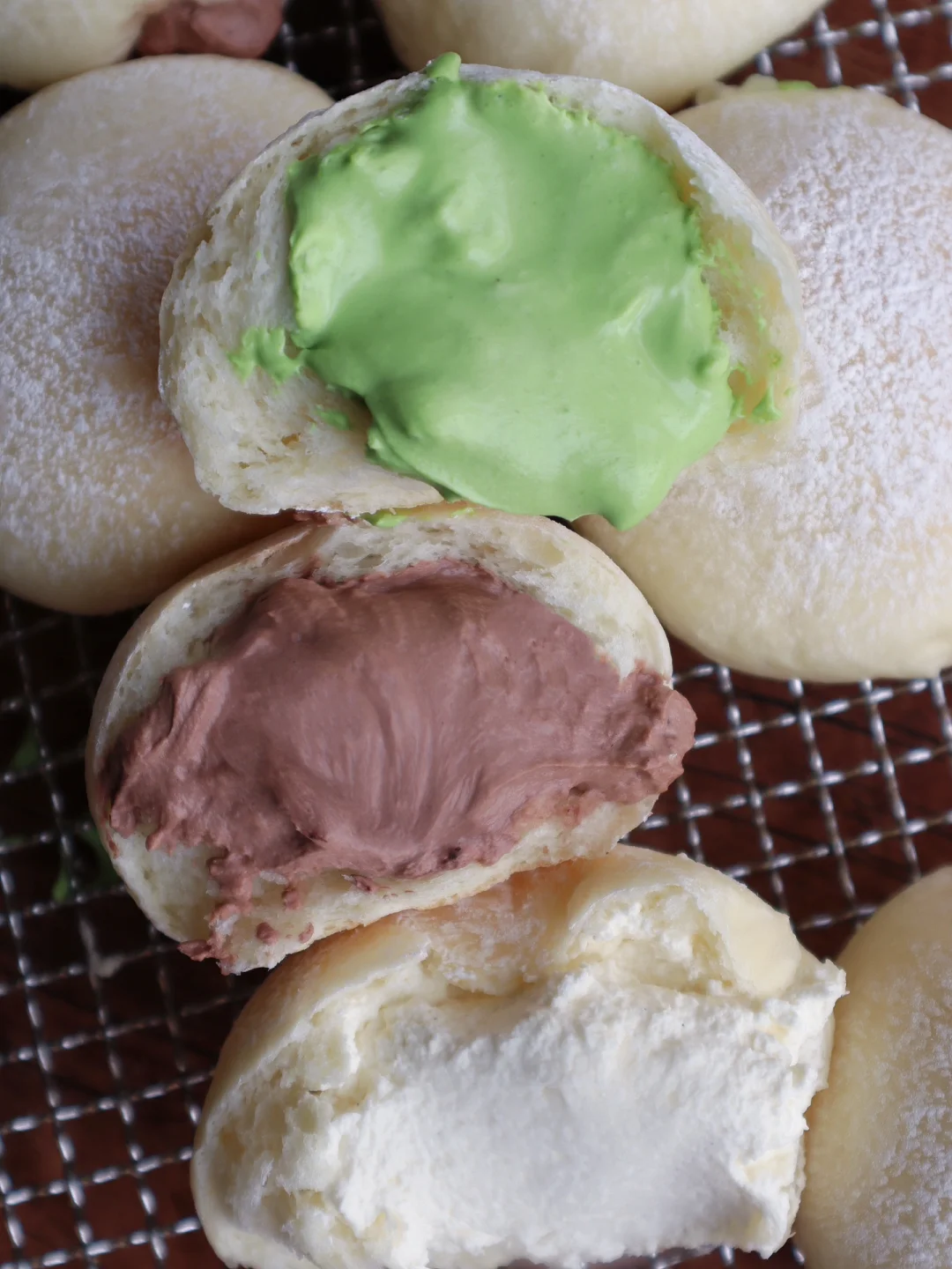 8⃣️奶油均分四份,分别加入可可粉&可可脆珠/开心果酱/香草籽调味、冷却好的面包侧边筷子戳洞,挤入奶油后冷冻10分钟即可食用