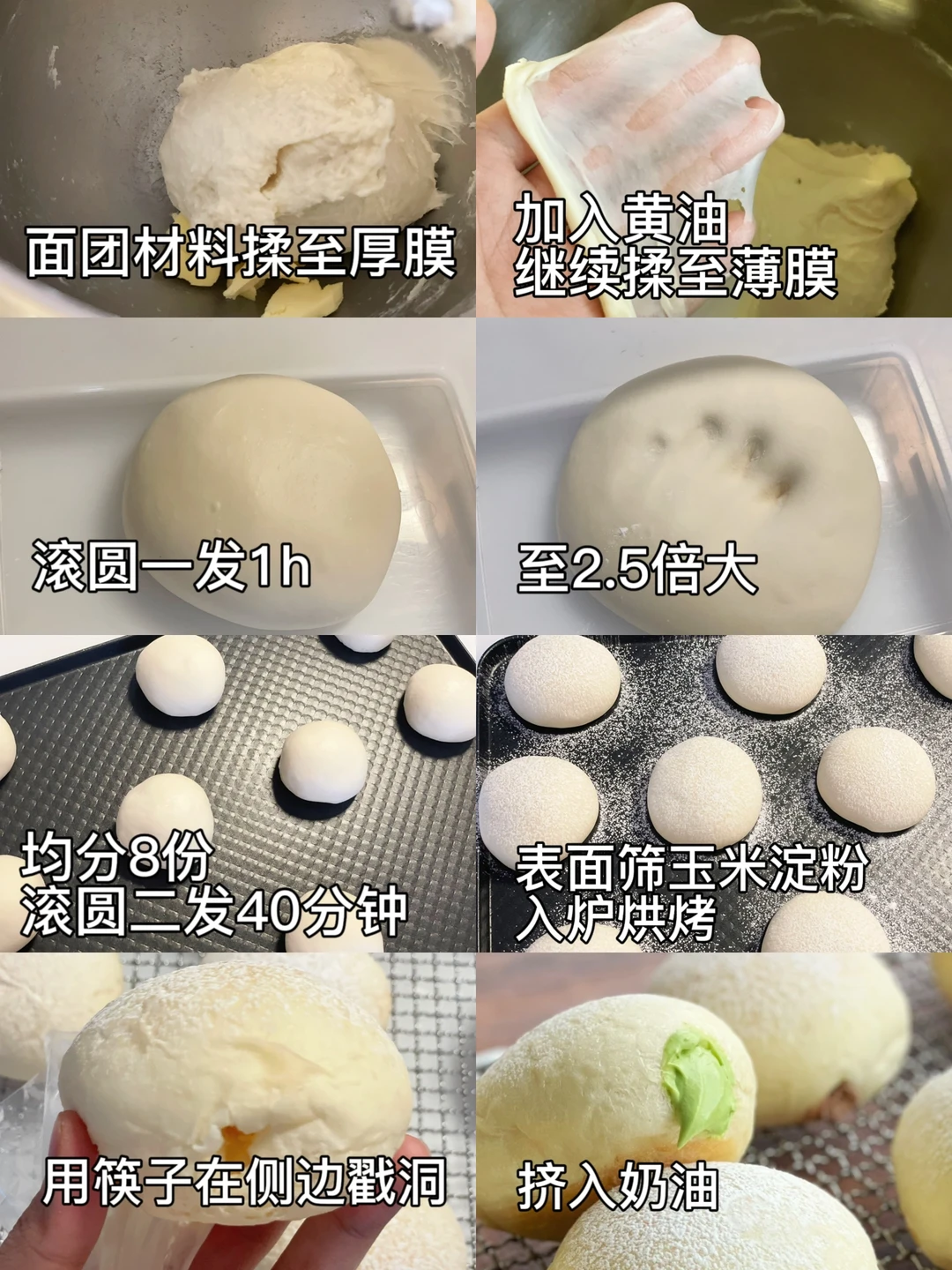 📎筛一层玉米淀粉是为了防止上色,出炉熟透的标志为不强烈回缩、喜欢有颜色的可以直接按照平时烤餐包的温度烘烤即可