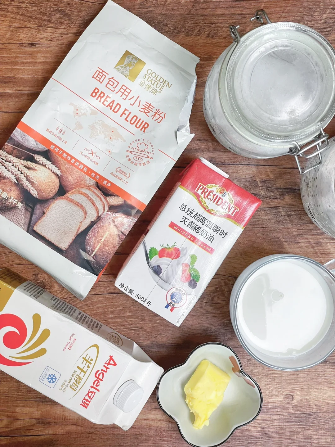 🥣主面团:金像高筋面粉210g|低粉40g|耐高糖干酵母2.5g)|盐3g|糖35g|奶粉8g|淡奶油30g|牛奶150|黄油30g