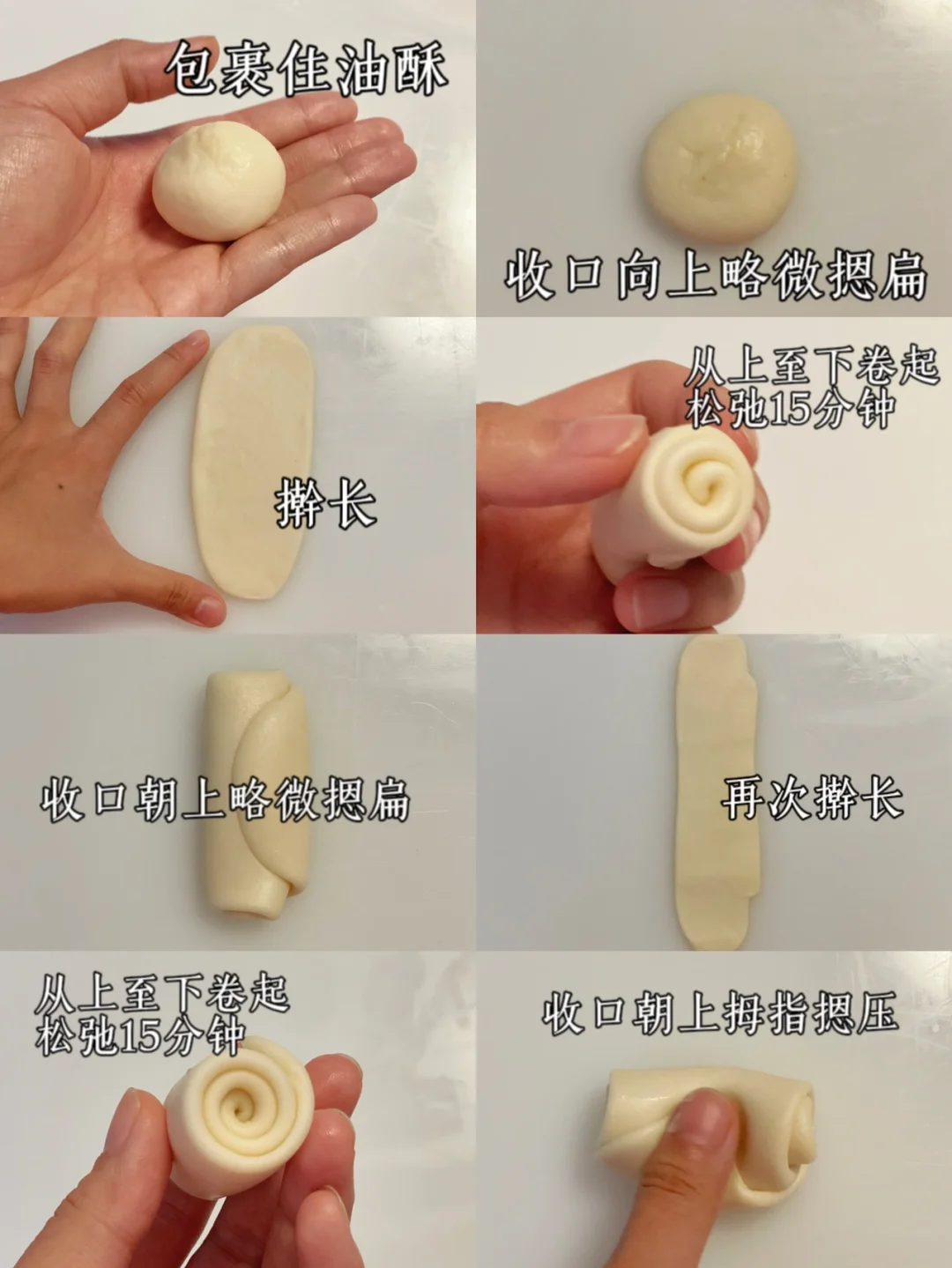 4⃣️水油皮略微拍扁;包裹油酥,类似包包子手法用虎口收口,收口请捏紧