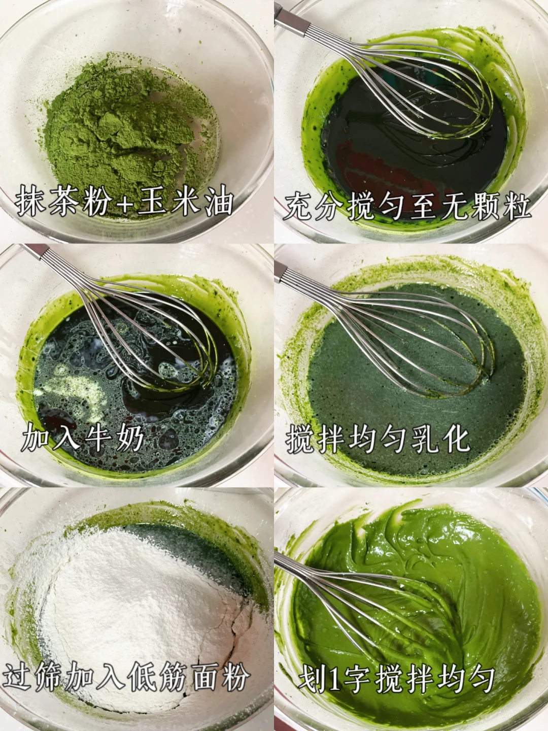 抹茶粉难溶于水,提前用玉米油融化会更加方便;同时也容易吸收水分,所以牛奶含量会适当增加~