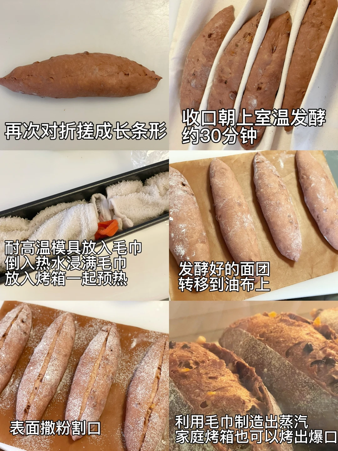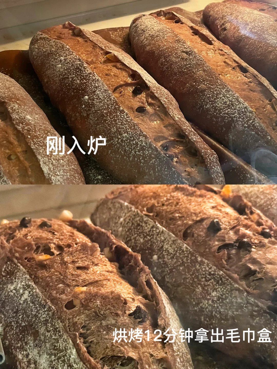 7⃣️轻轻将面团转移到油布上,表面撒粉割口;再将油布滑到烤箱里,230度烘烤16-18分钟,10分钟时将毛巾盒取出,请随时观察上色