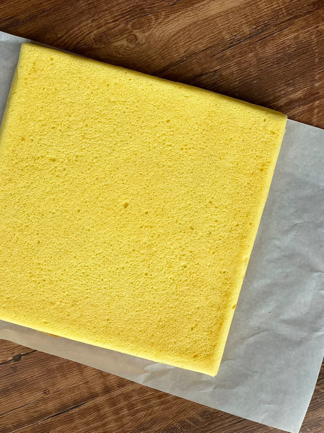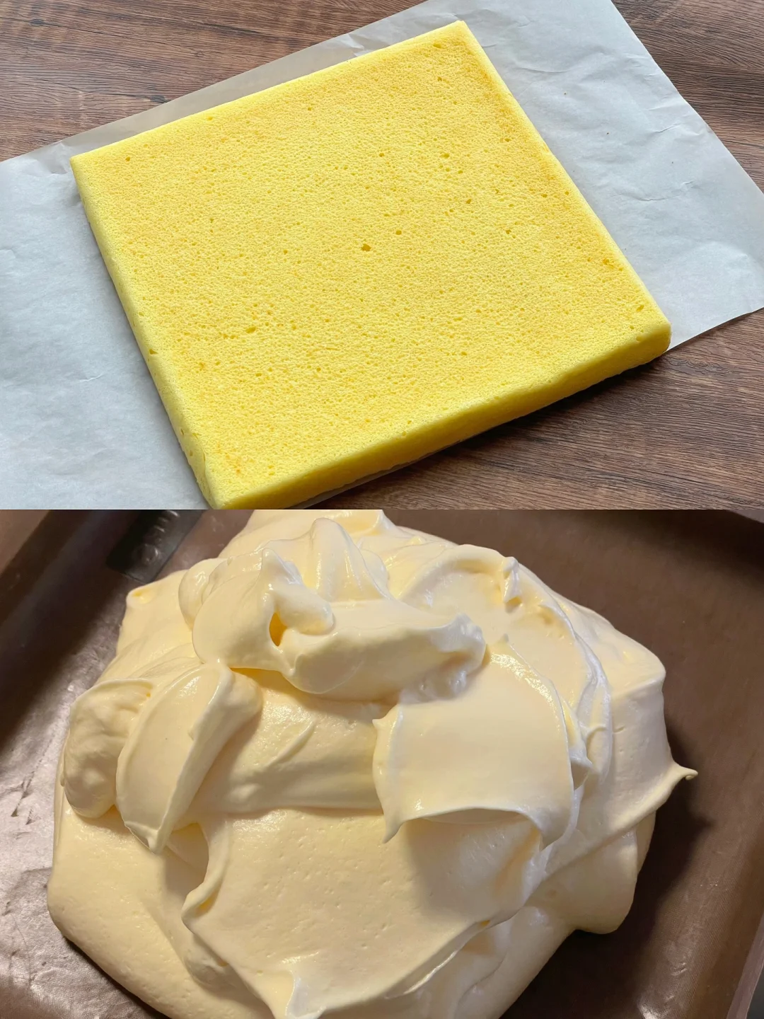 9⃣️出炉覆盖油纸倒扣晾凉;均匀涂抹打发好的奶油,卷起冷冻30分钟定型即可