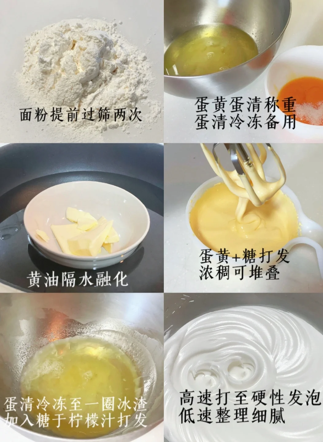 1⃣️蛋黄蛋清分离称重,蛋清加入糖于柠檬汁冷冻备用;低筋面粉过筛两次备用